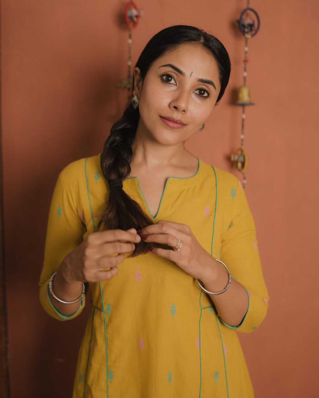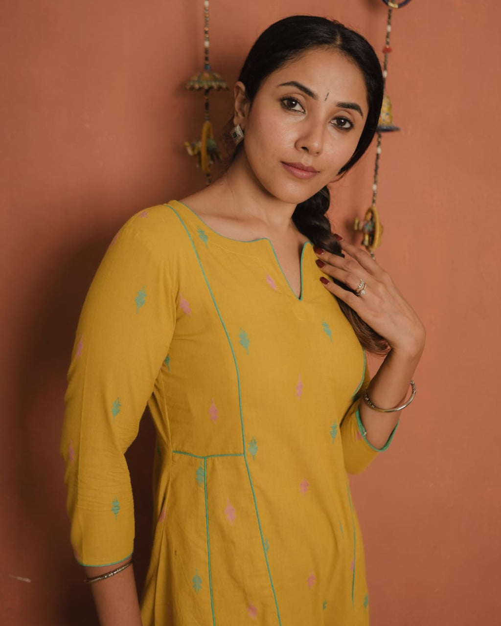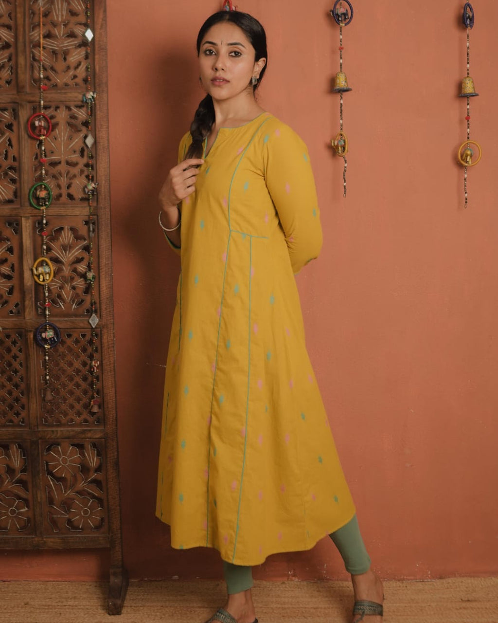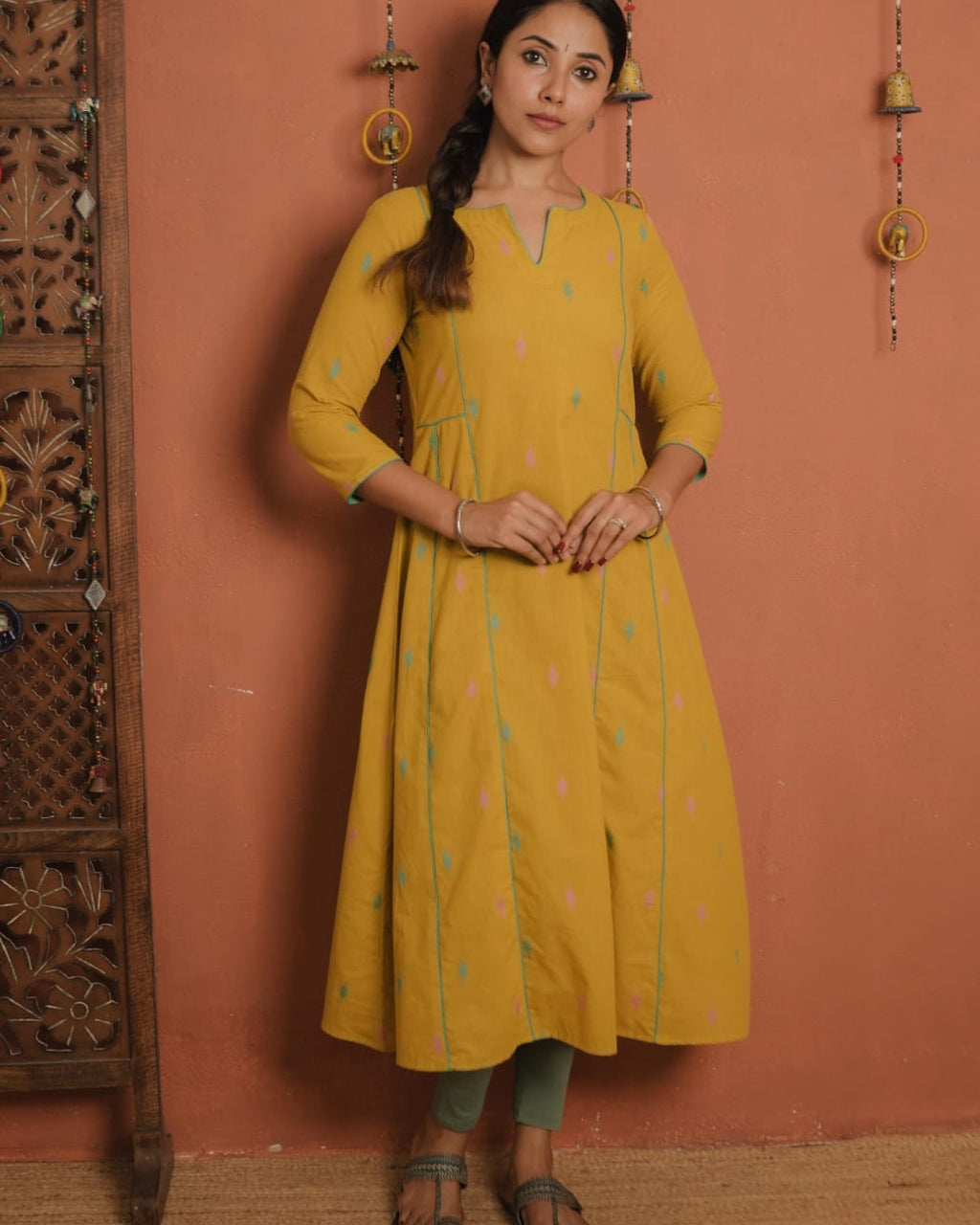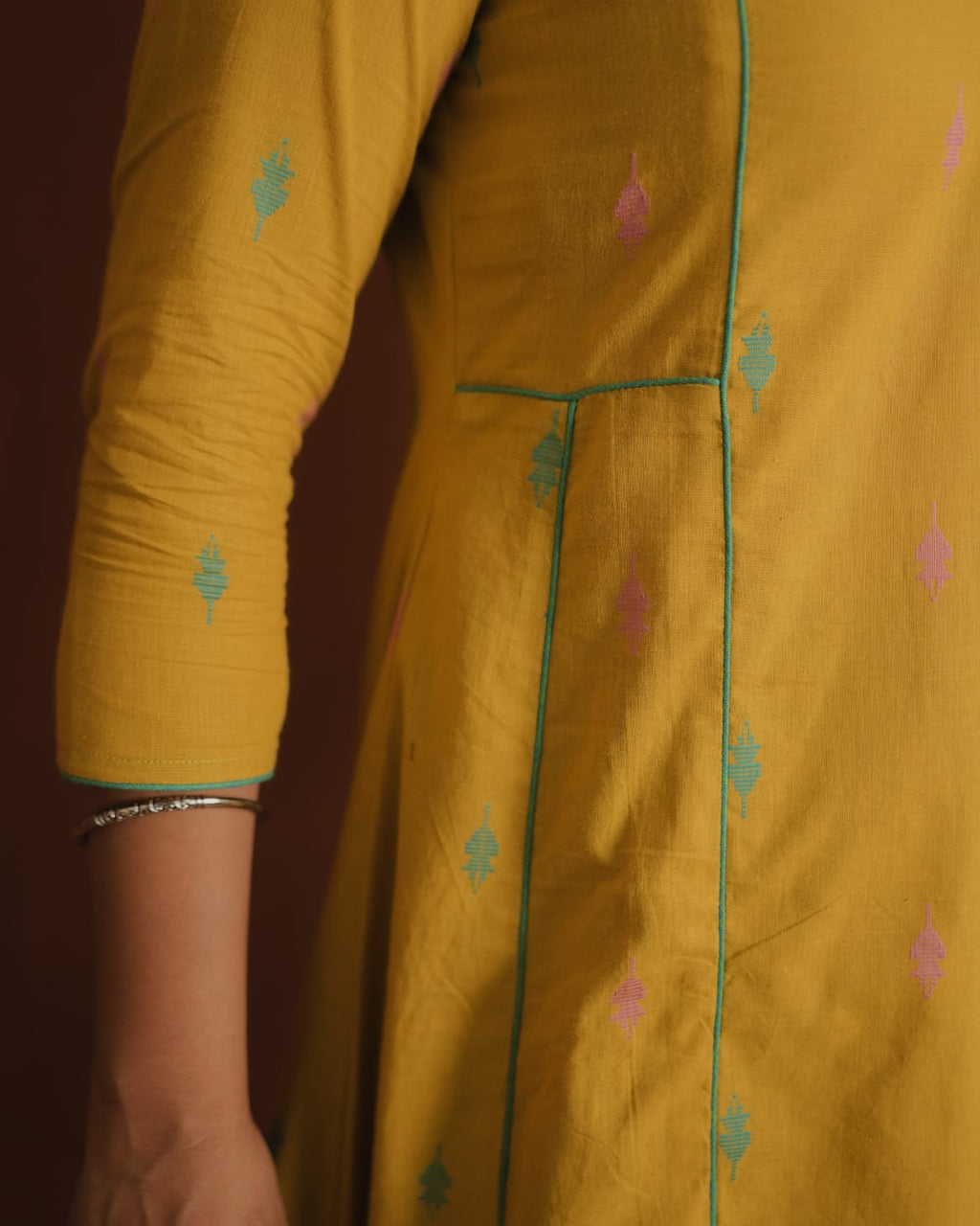 Handloom cotton A-line kurthi designed with slit V-neckline. The fabric has beautiful woven buttis across the body. Contrast piping highlights the neckline, center panel, side seams and sleeves end.