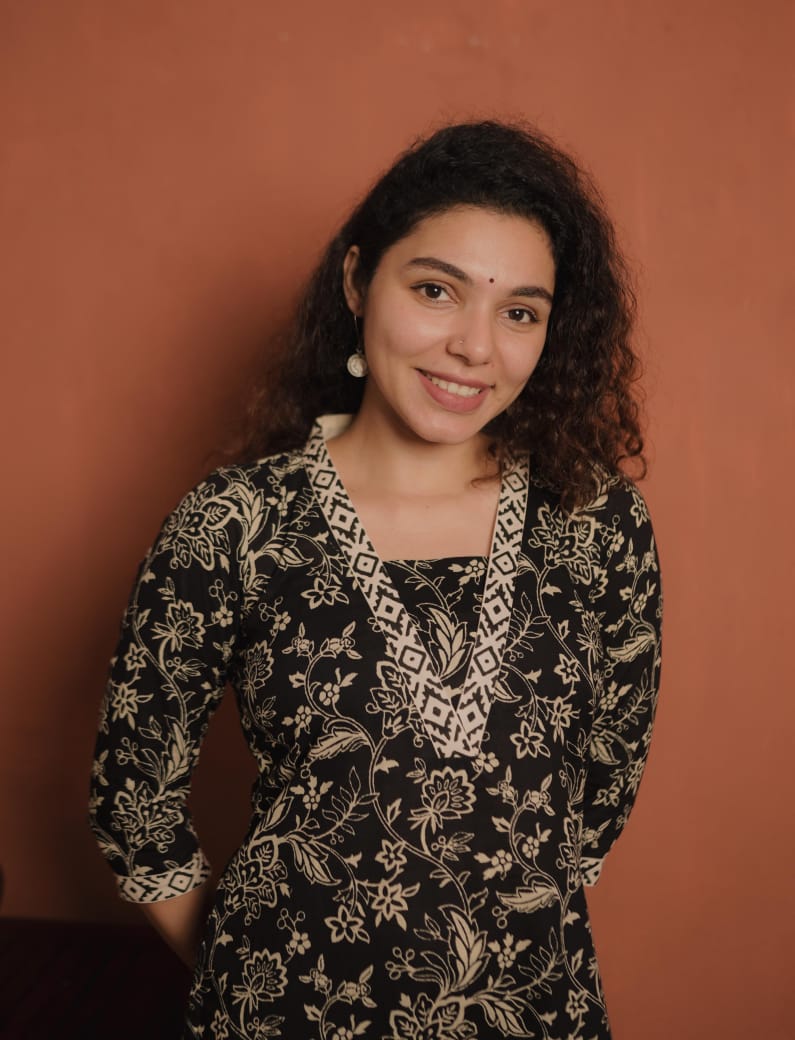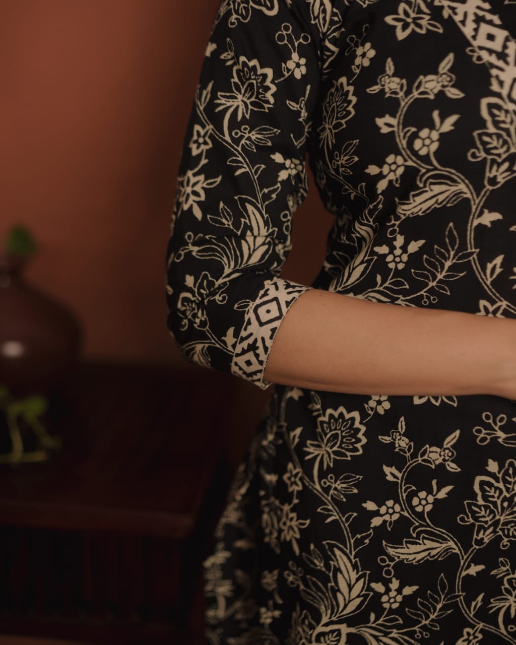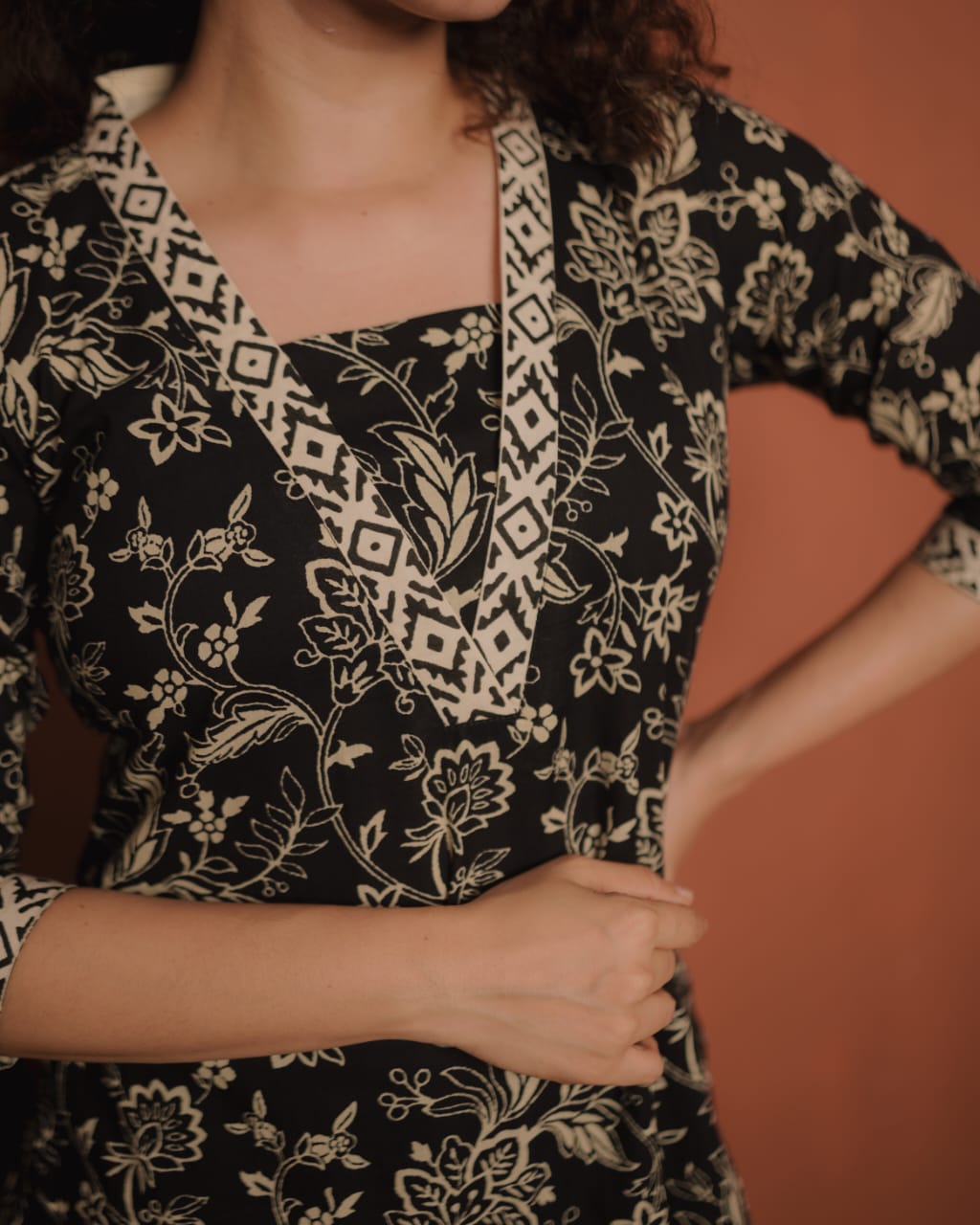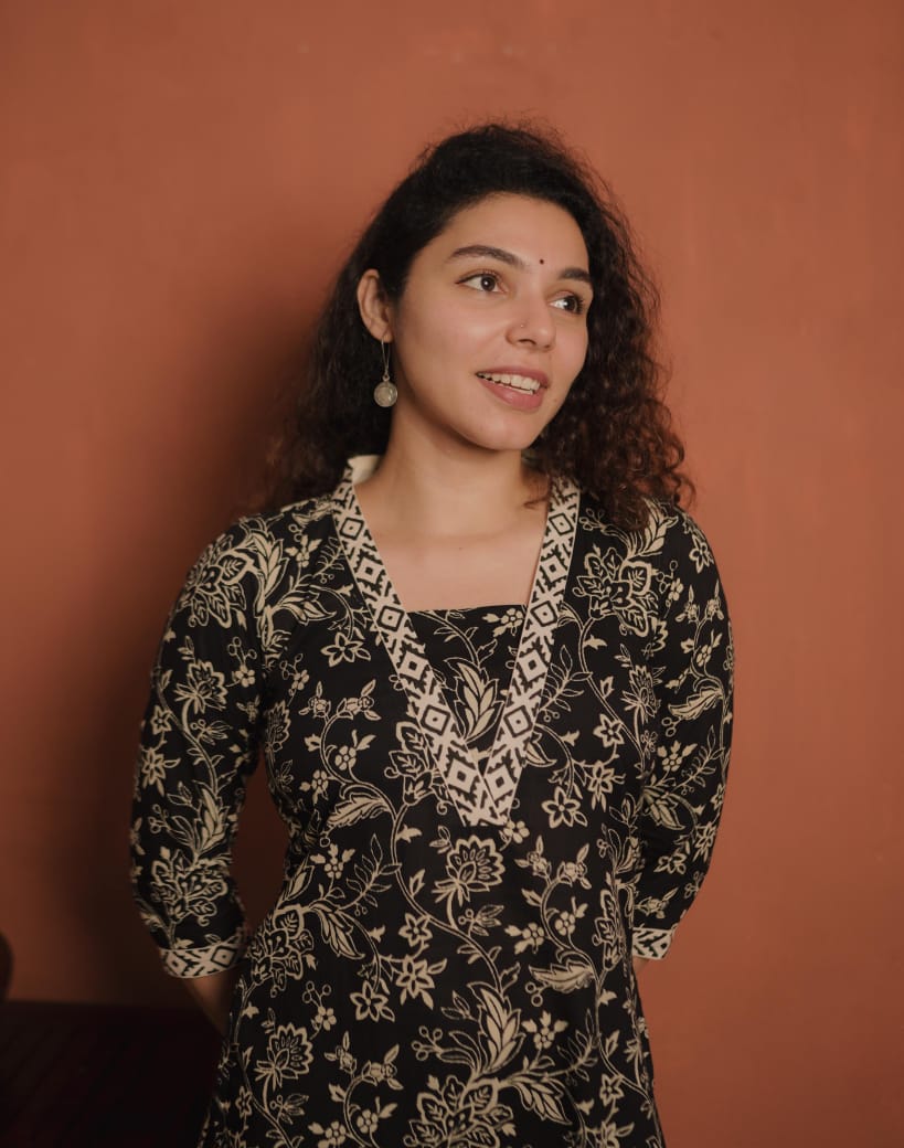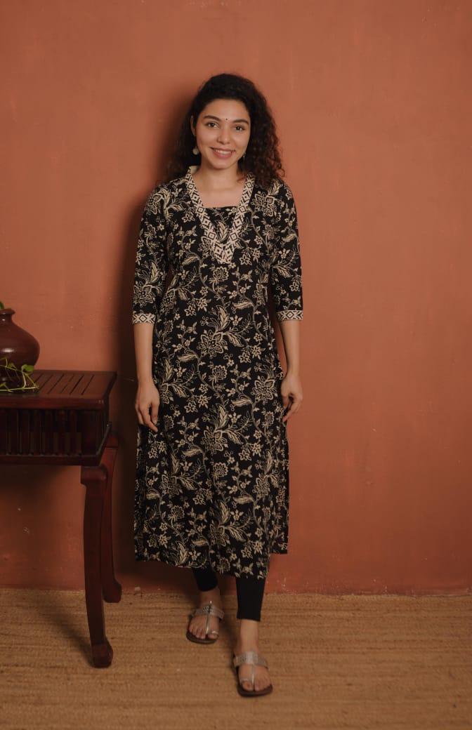 Printed Cotton Slit kurthi with rolling collar neck. Printed border on neck and sleeves end.