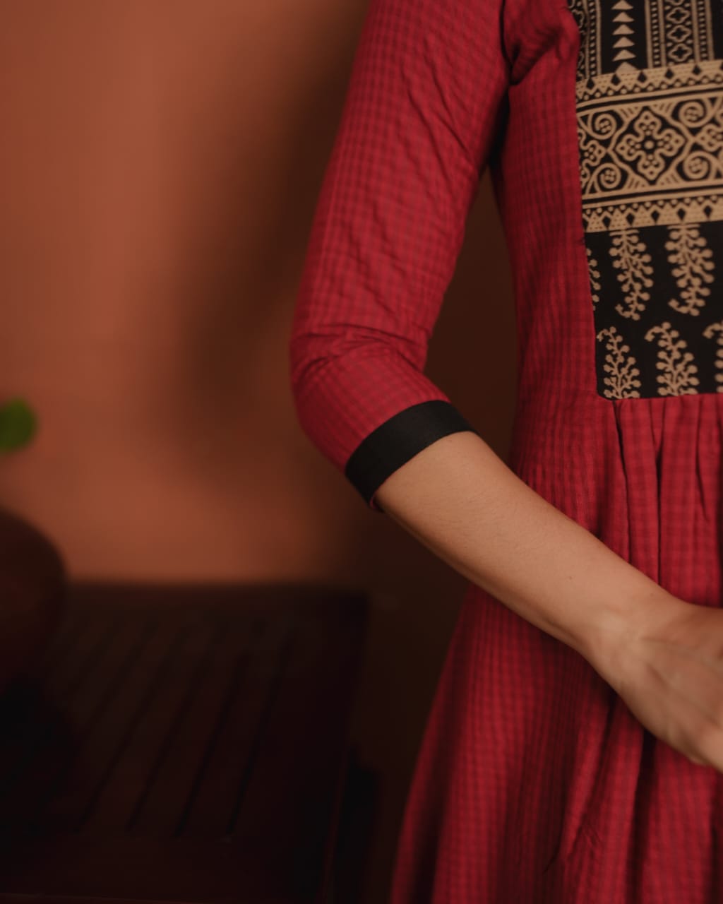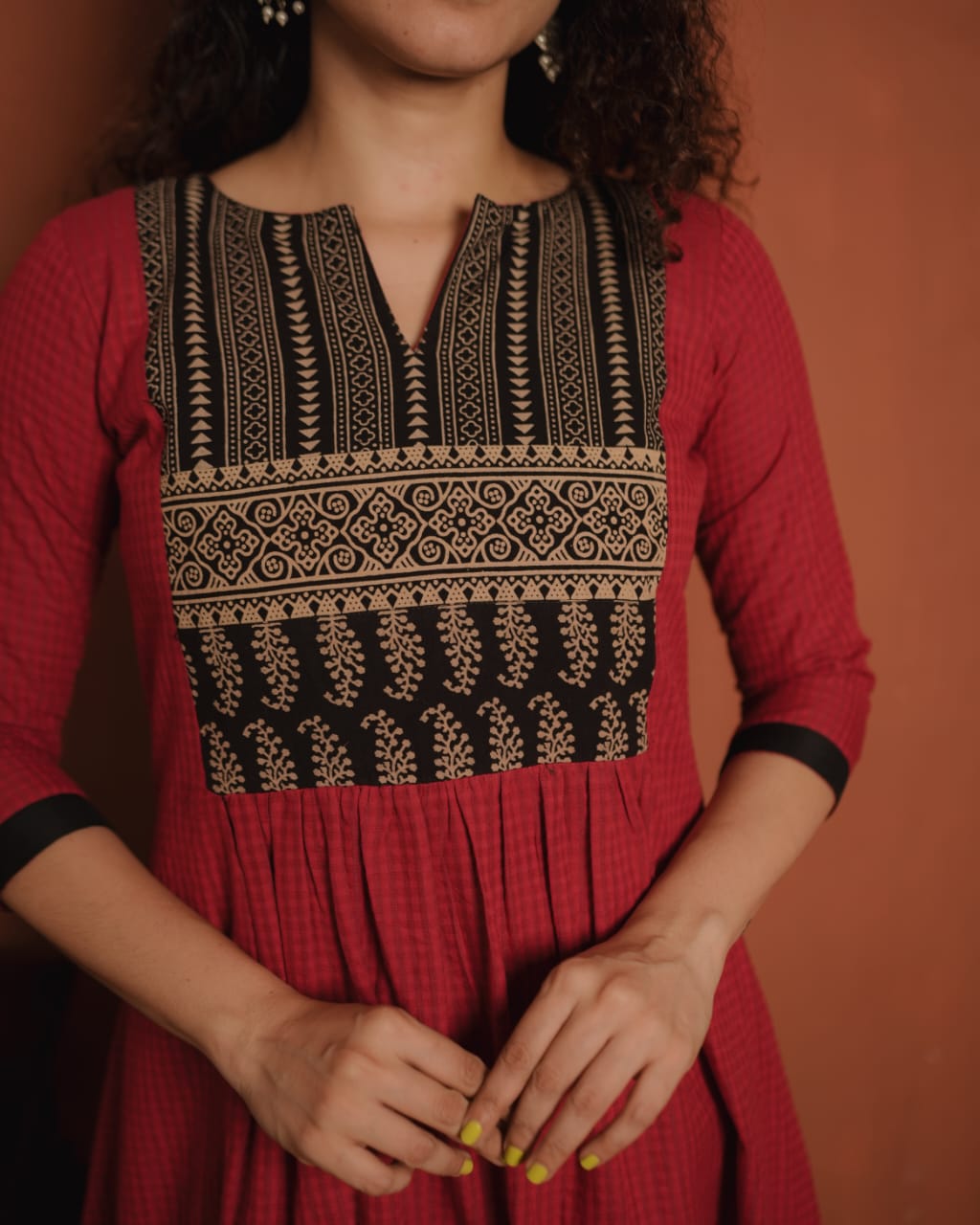 Dobby check Cotton A-Line Kurthi with slit V neck. Three layered Ajrakh patch on Yoke and gathers on yoke portion. Plain patch at the Sleeves end.