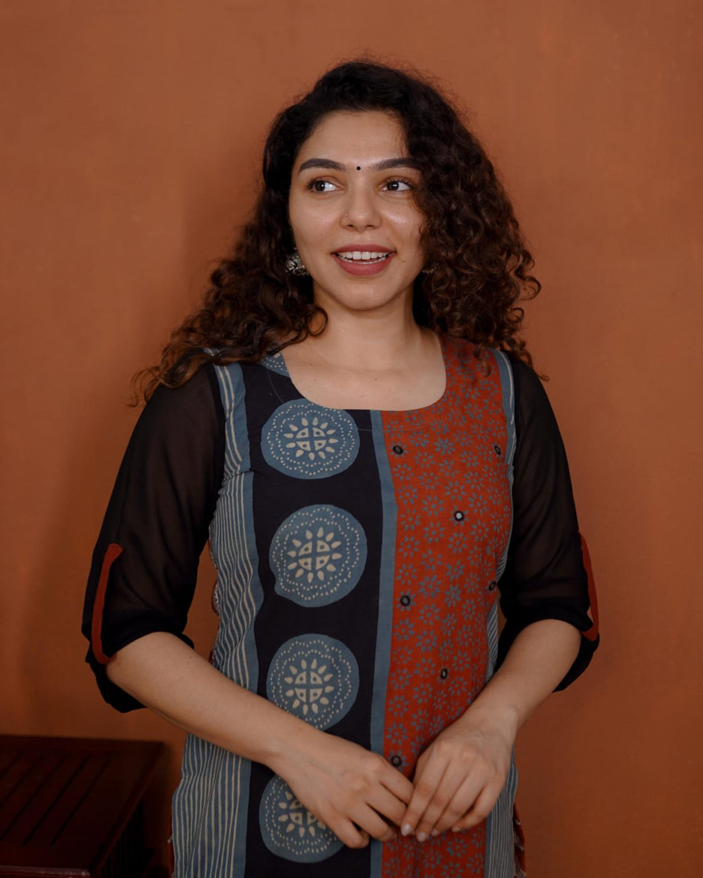 Natural Ajrakh Printed Cotton Slit Kurthi with Round Neck, Dabu print with Ajarkh patch on back Portion,