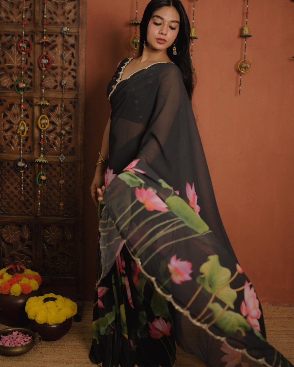 Crape Georgette Saree with Floral digital Prints. Hand Embroidery on the Borders for Detailing.