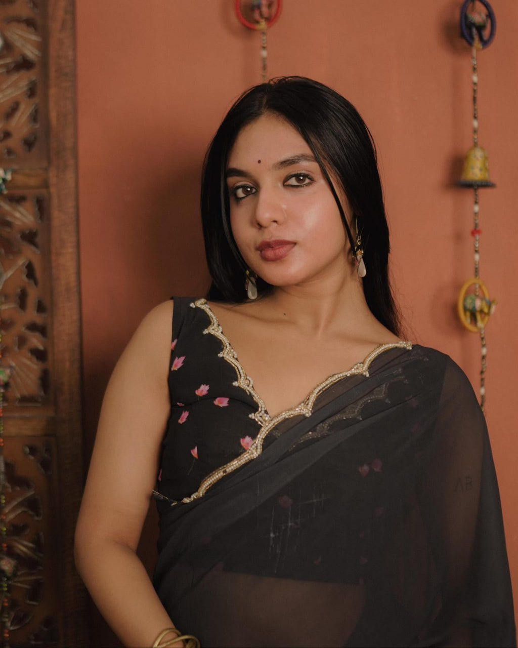 Blouse :- Crape georgette Blouse with Small floral print and Hand Embroidery Work on Neck and Sleeves.