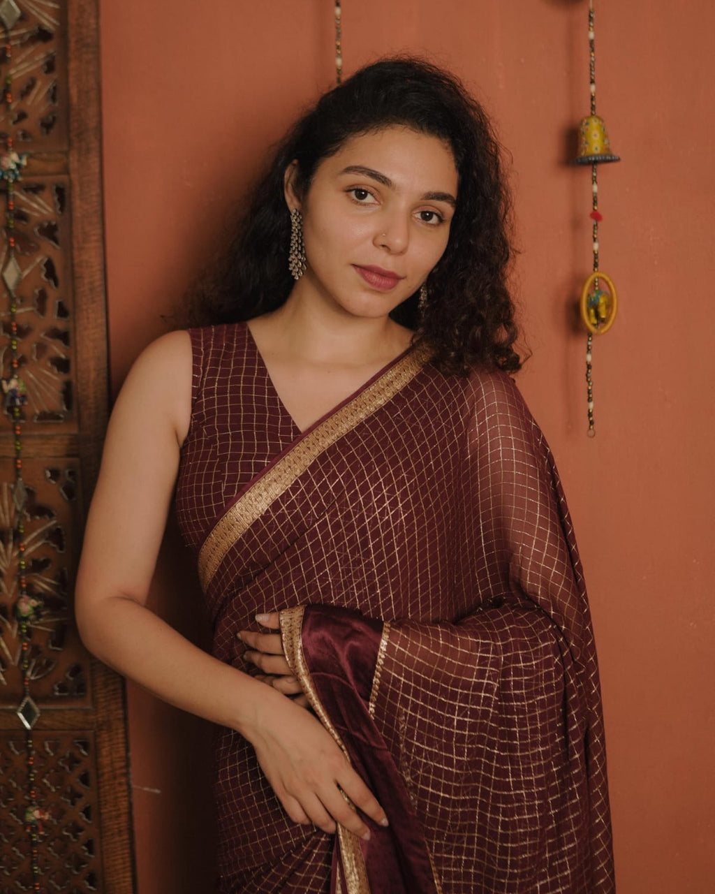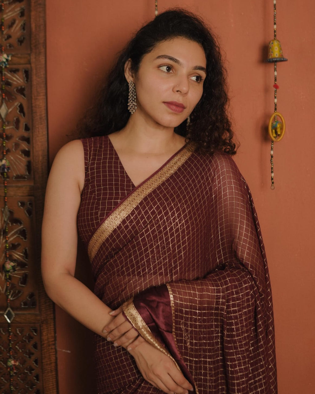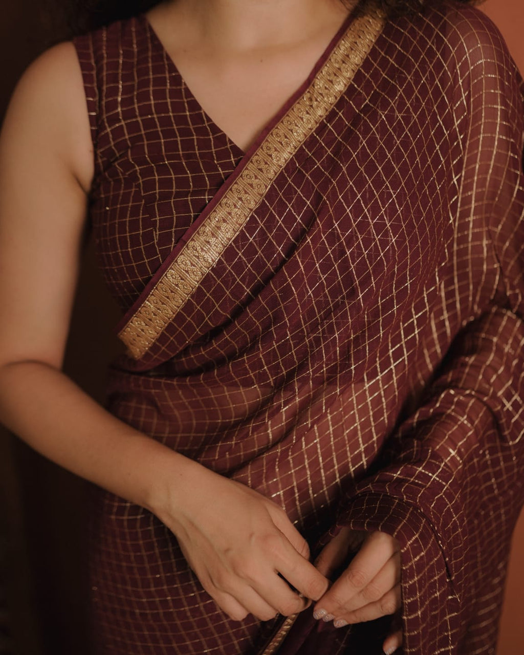 Designer Georgette Saree with Golden Woven Checks. Soft Satin Crape with Golden Woven at the Borders.