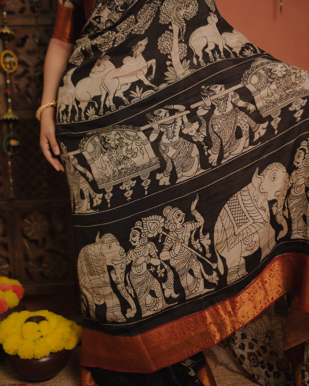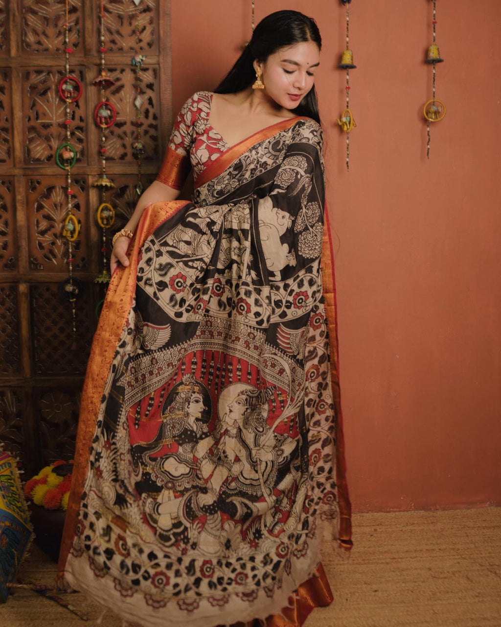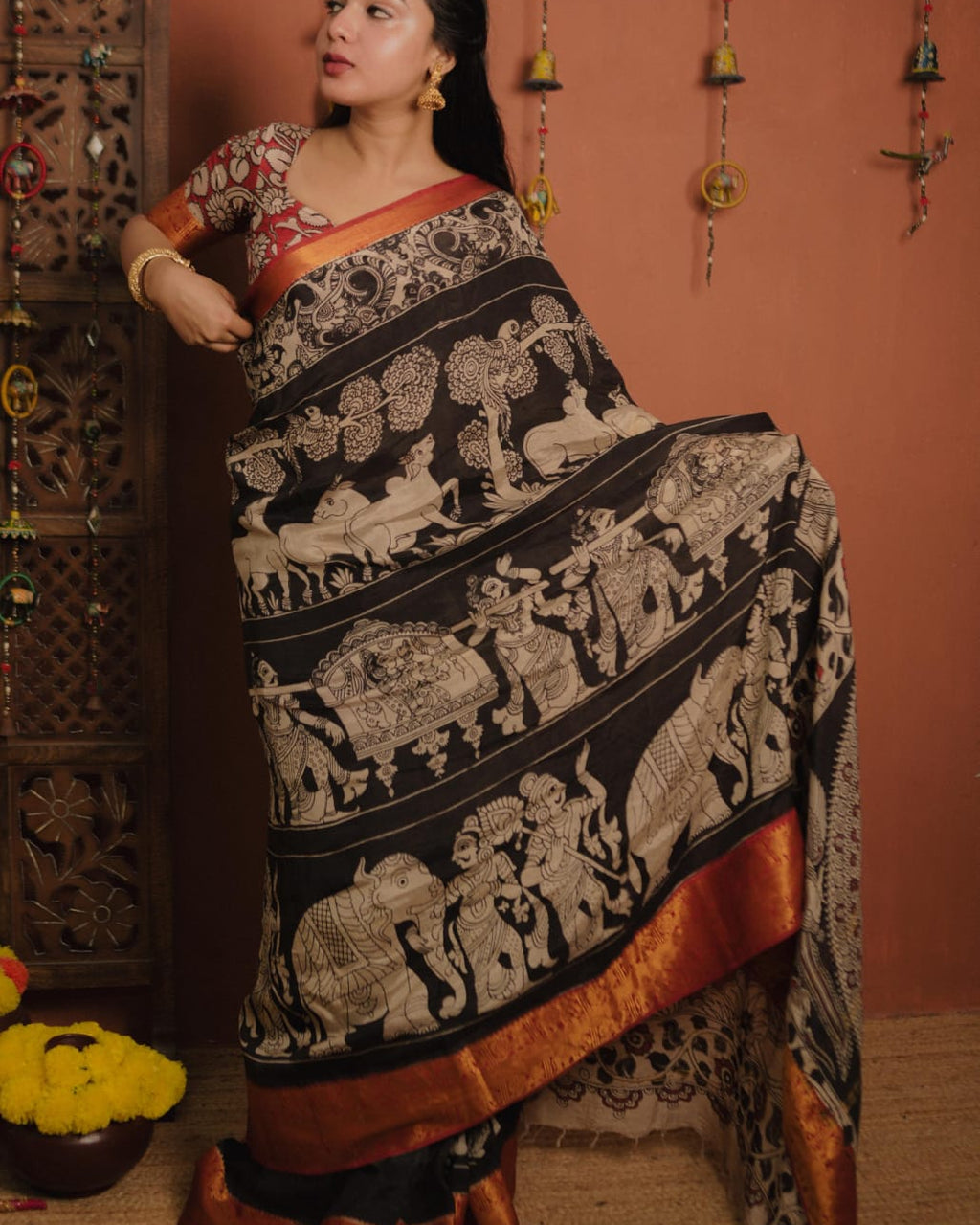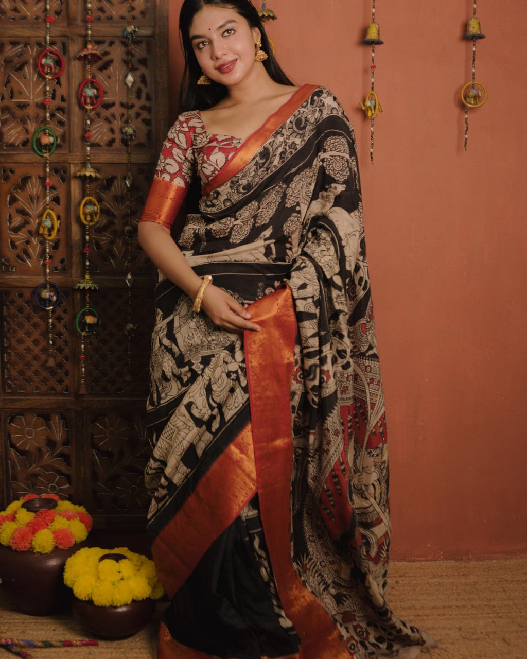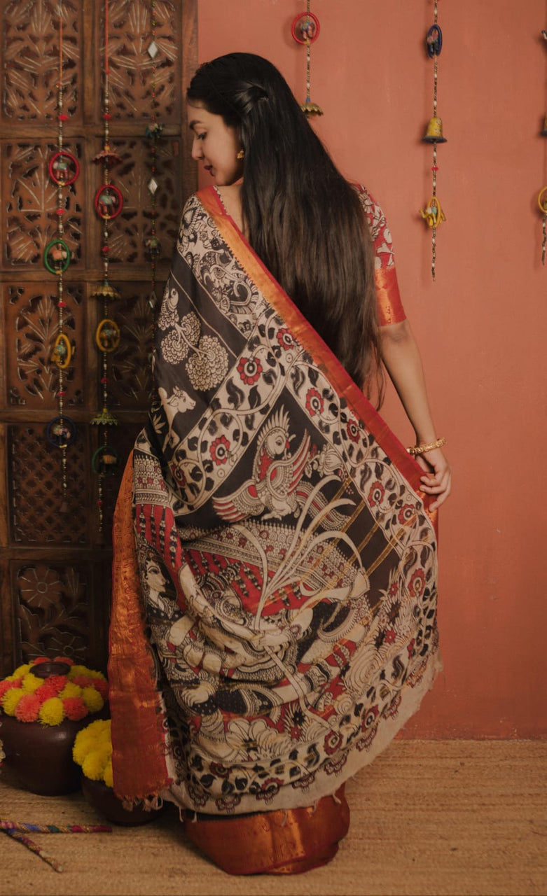 Handloom Soft Silk partly print Saree in Designer Kalamkari Print with Golden Bavanji Zeri Border