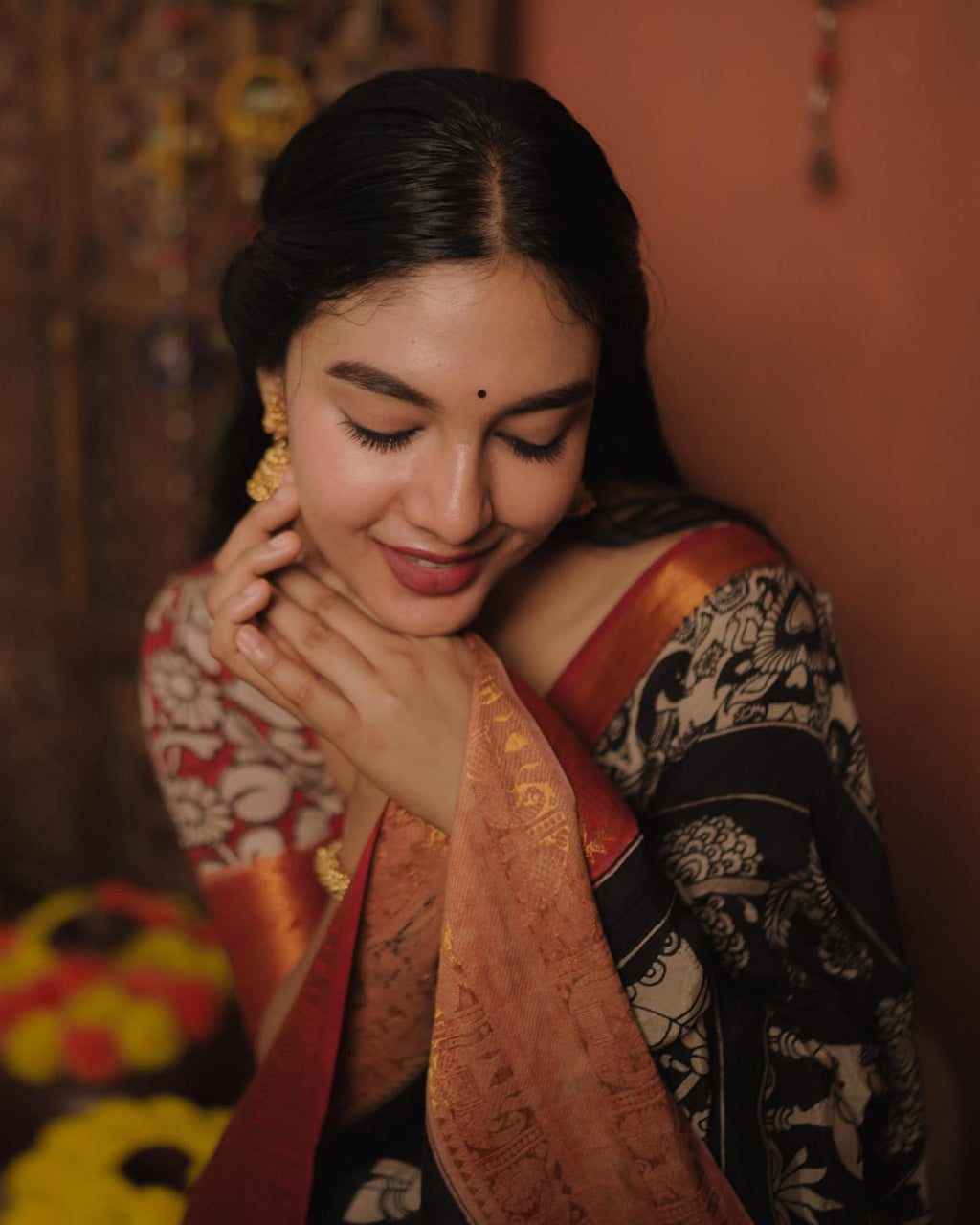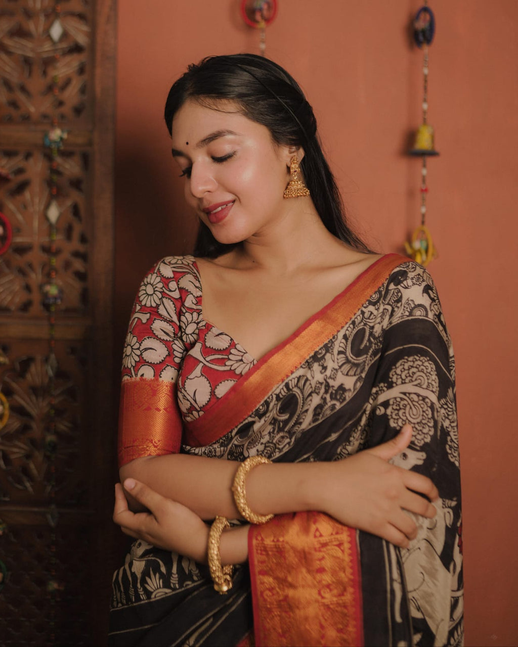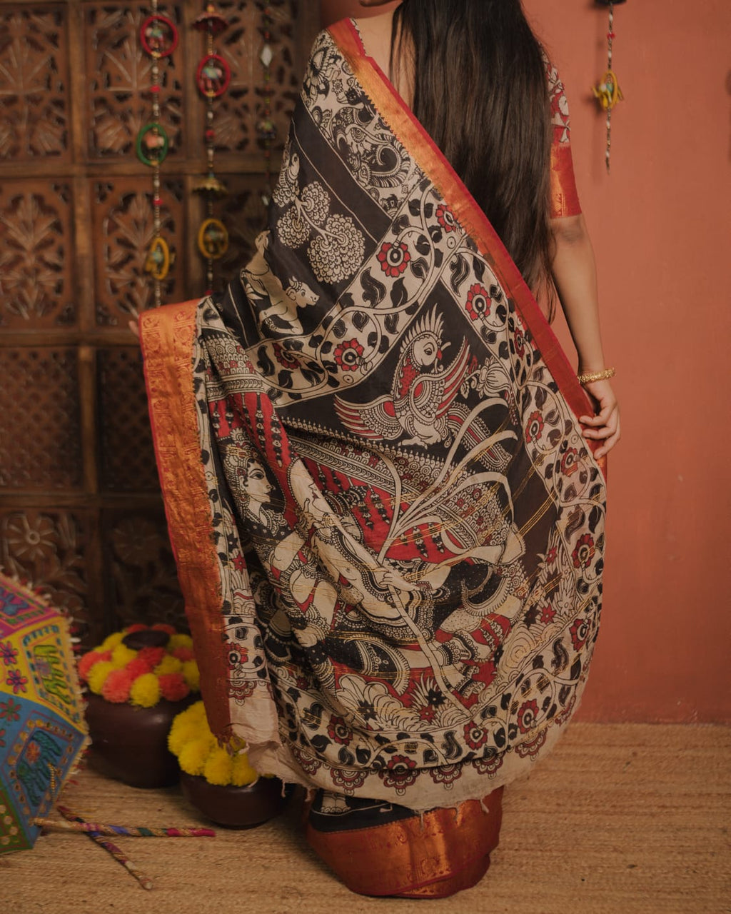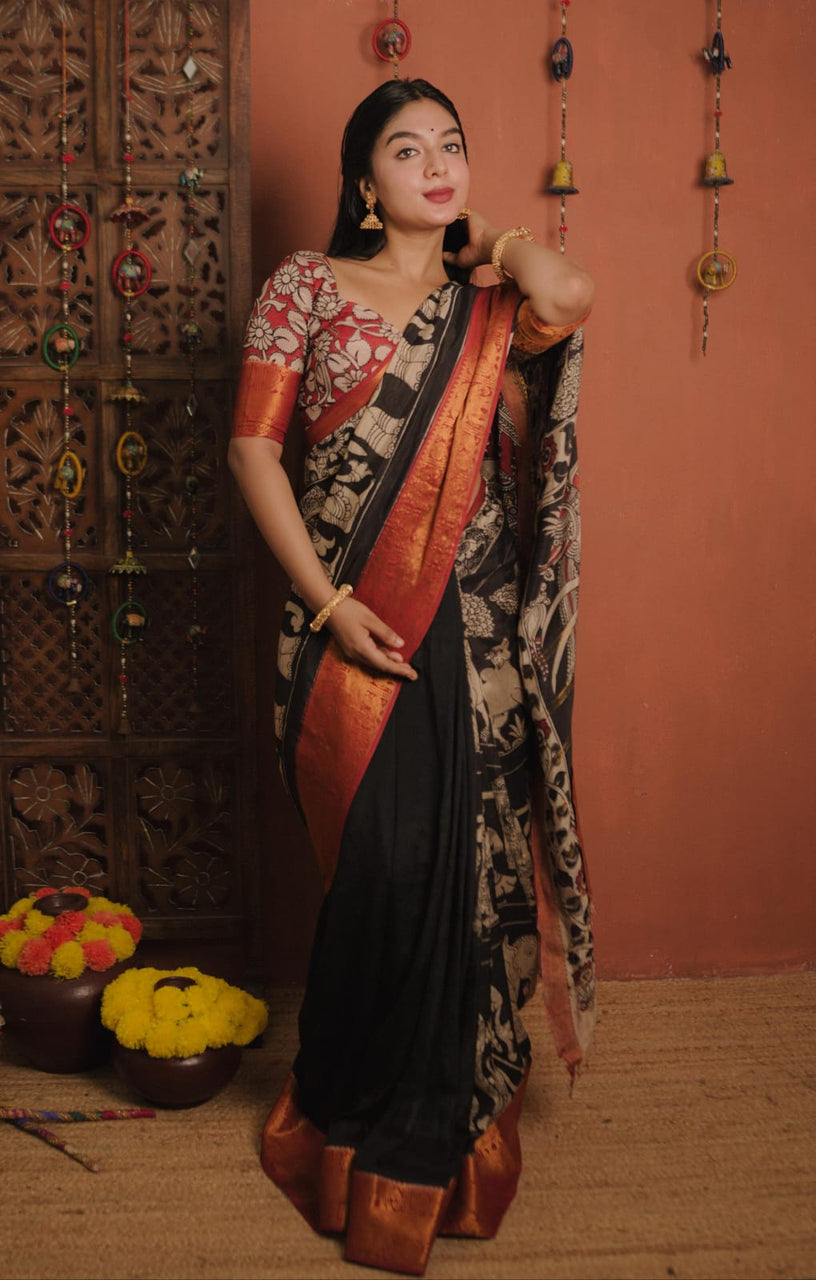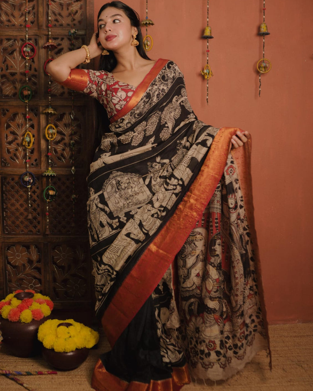 Handloom Soft Silk partly print Saree in Designer Kalamkari Print with Golden Bavanji Zeri Border