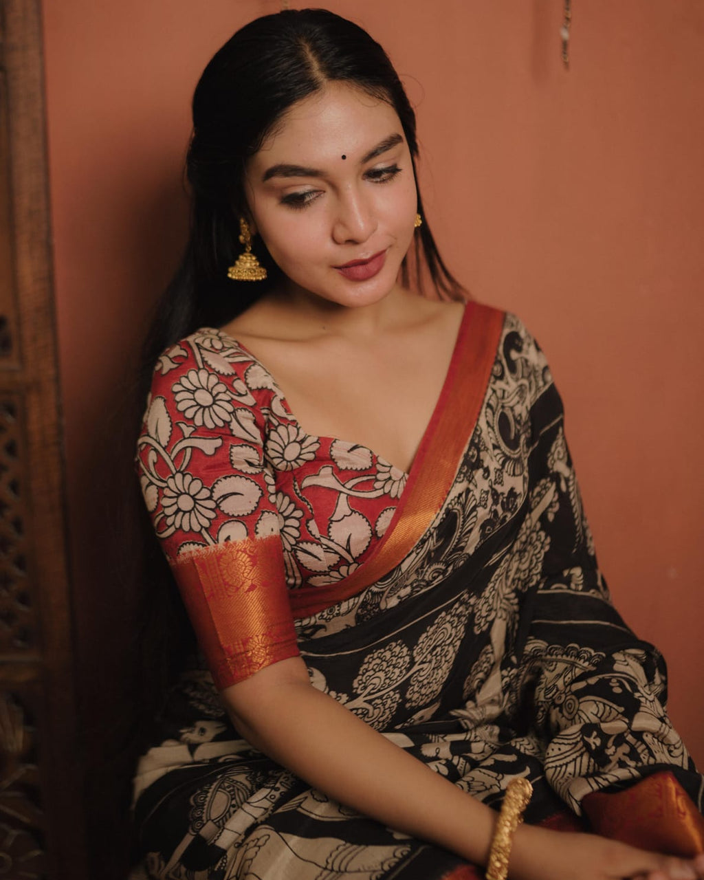 Blouse :- Handloom Soft Silk in Running  Kalamkari Print with Kanchi Border. (Unstitched Blouse)