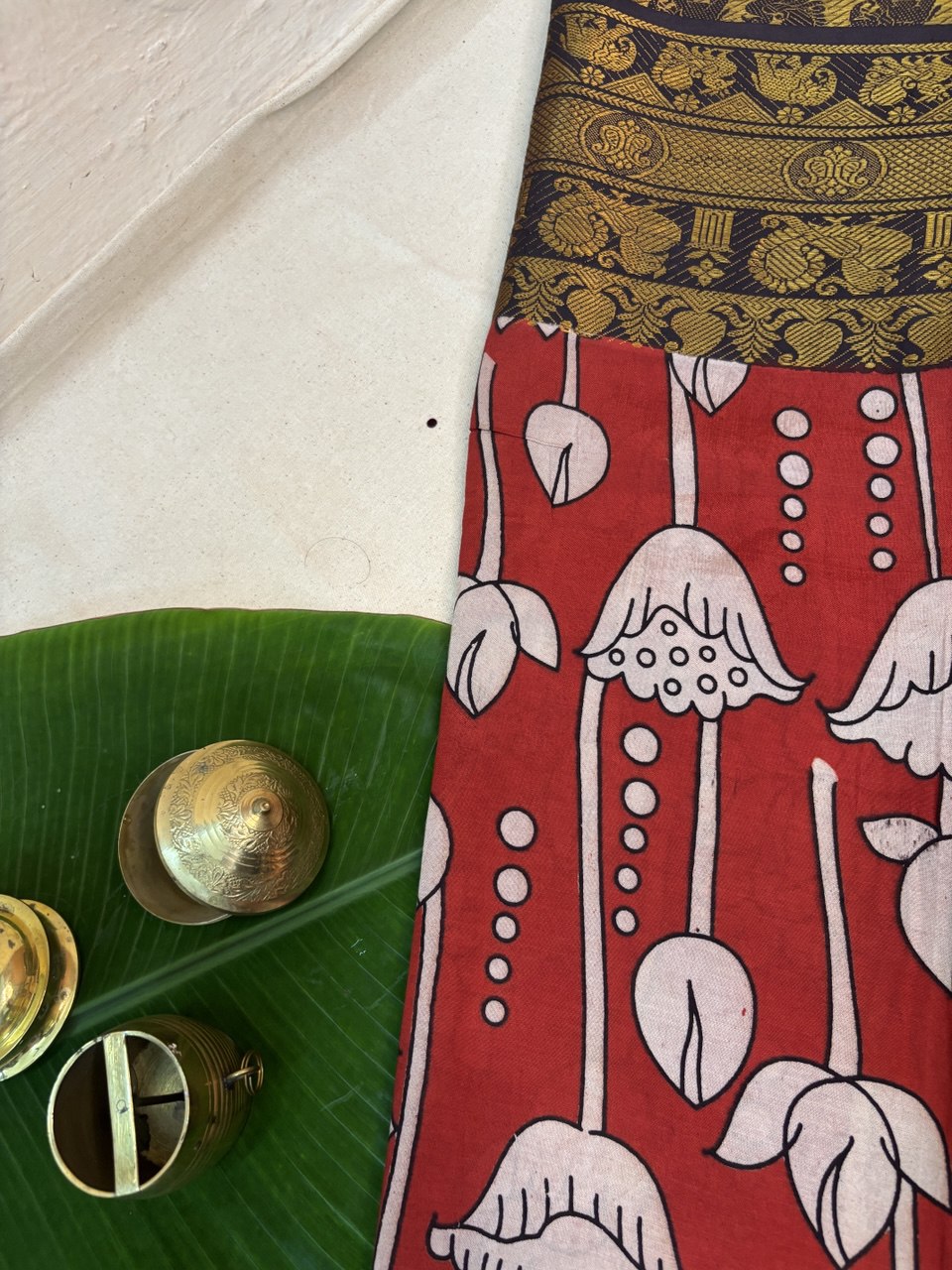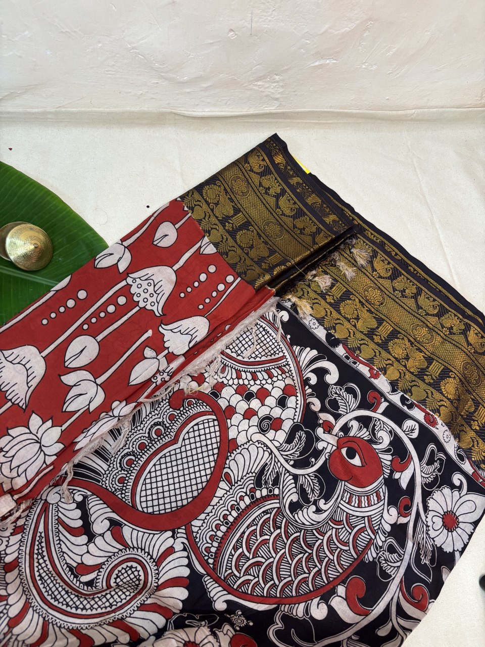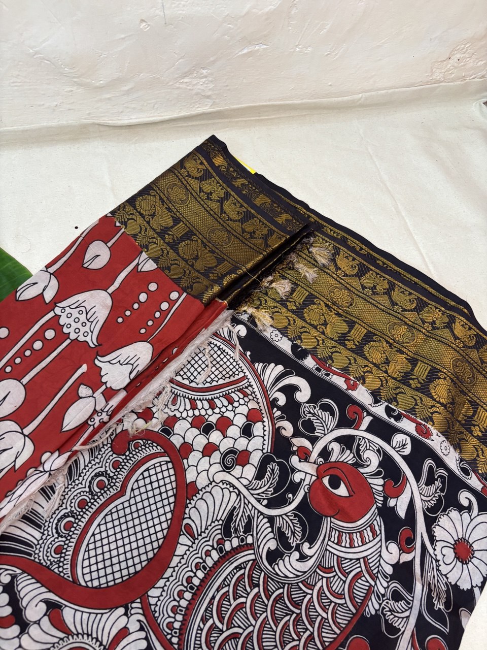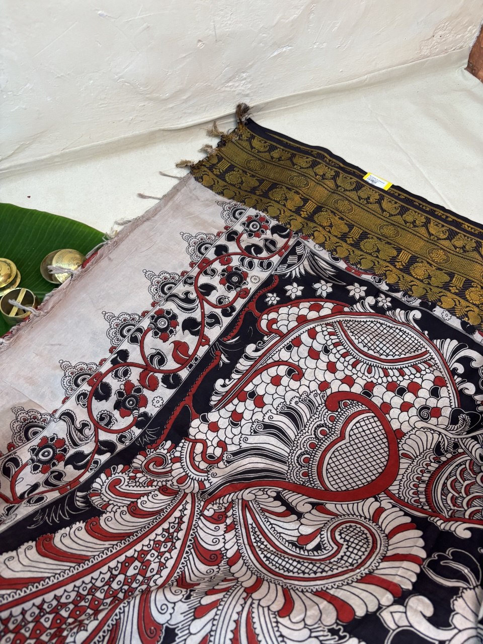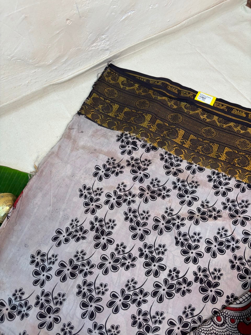 Handloom Soft Silk print Saree in Designer Kalamkari Print with Golden Bavanji Zeri Border