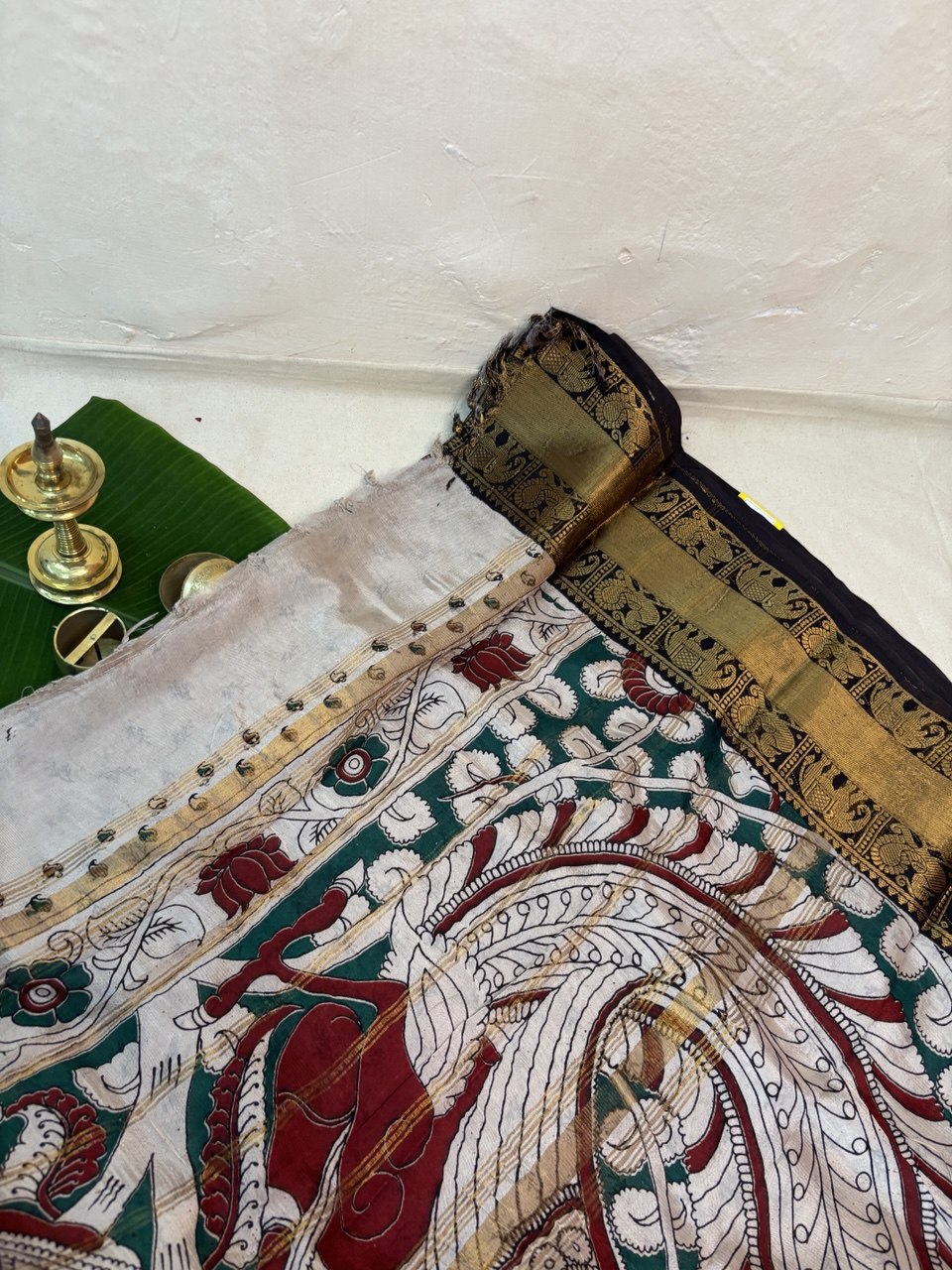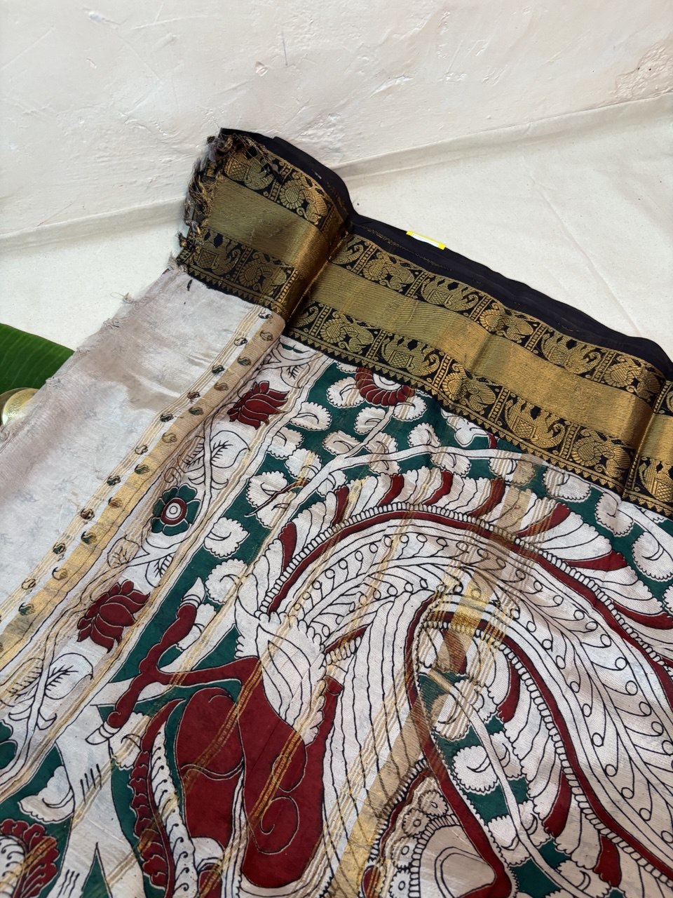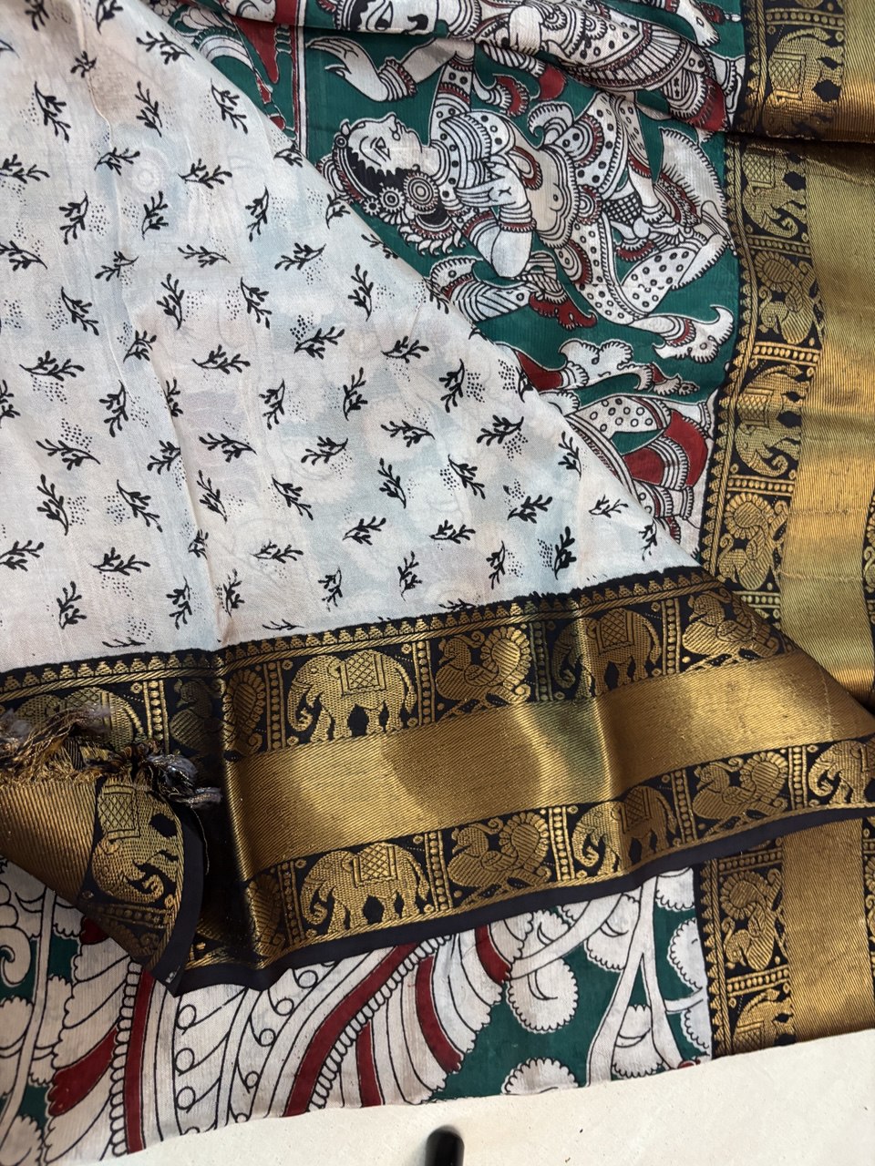 Handloom Soft Silk print Saree in Designer Kalamkari Print with Golden Bavanji Zeri Border