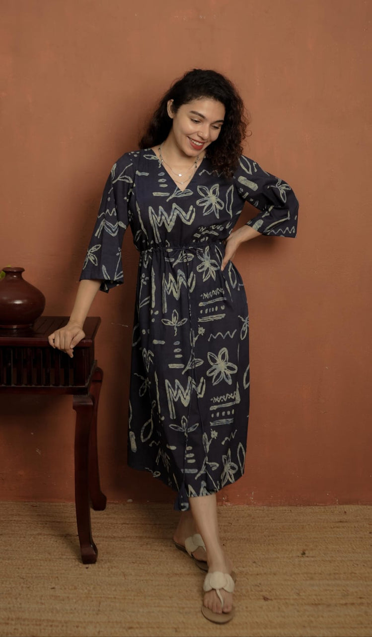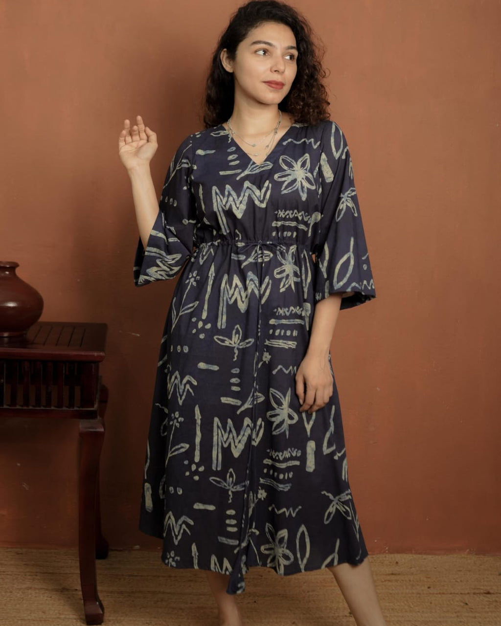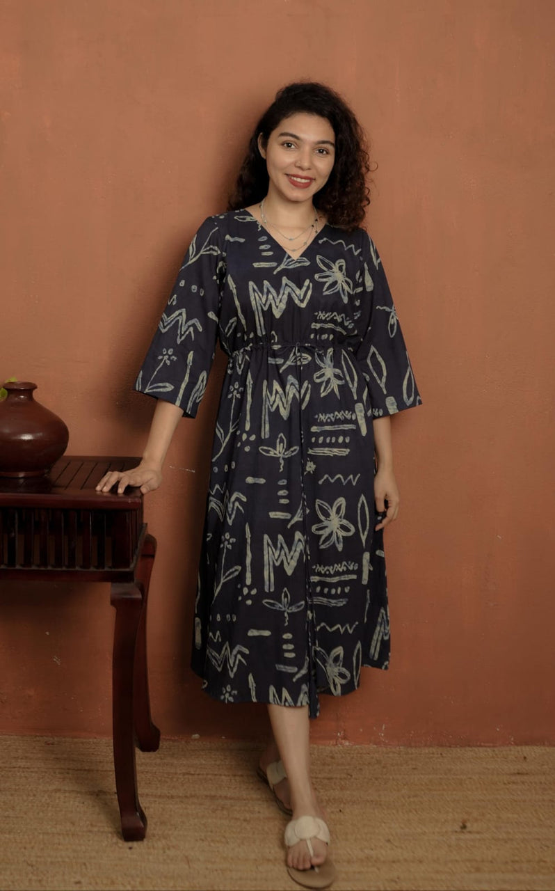 Indigo Cotton Kafthan Dress with V Neck. Shaping Tags on the Waist to make the fitting correct. Loose bell Sleeves.