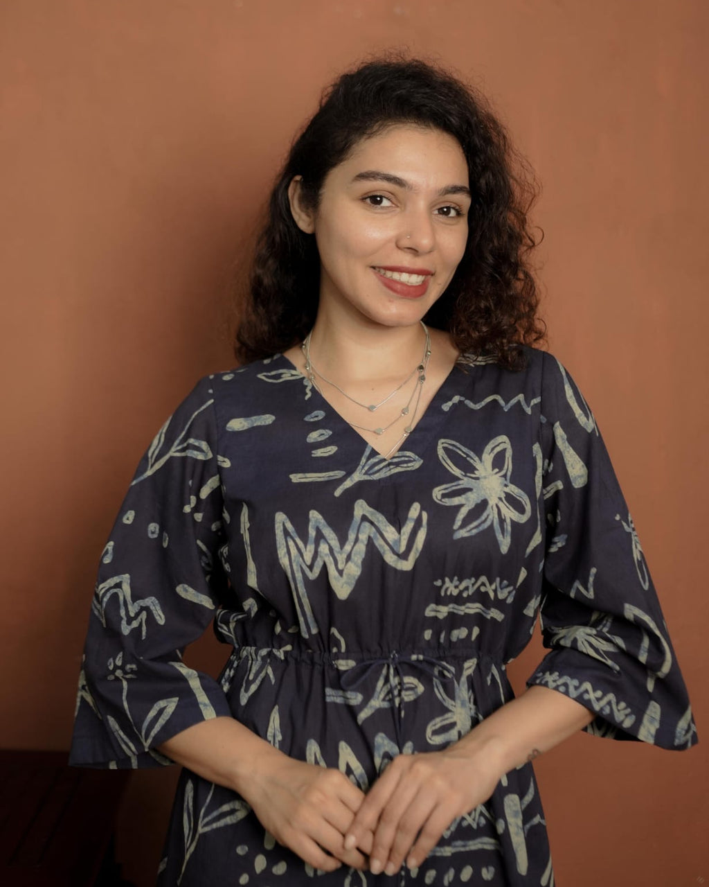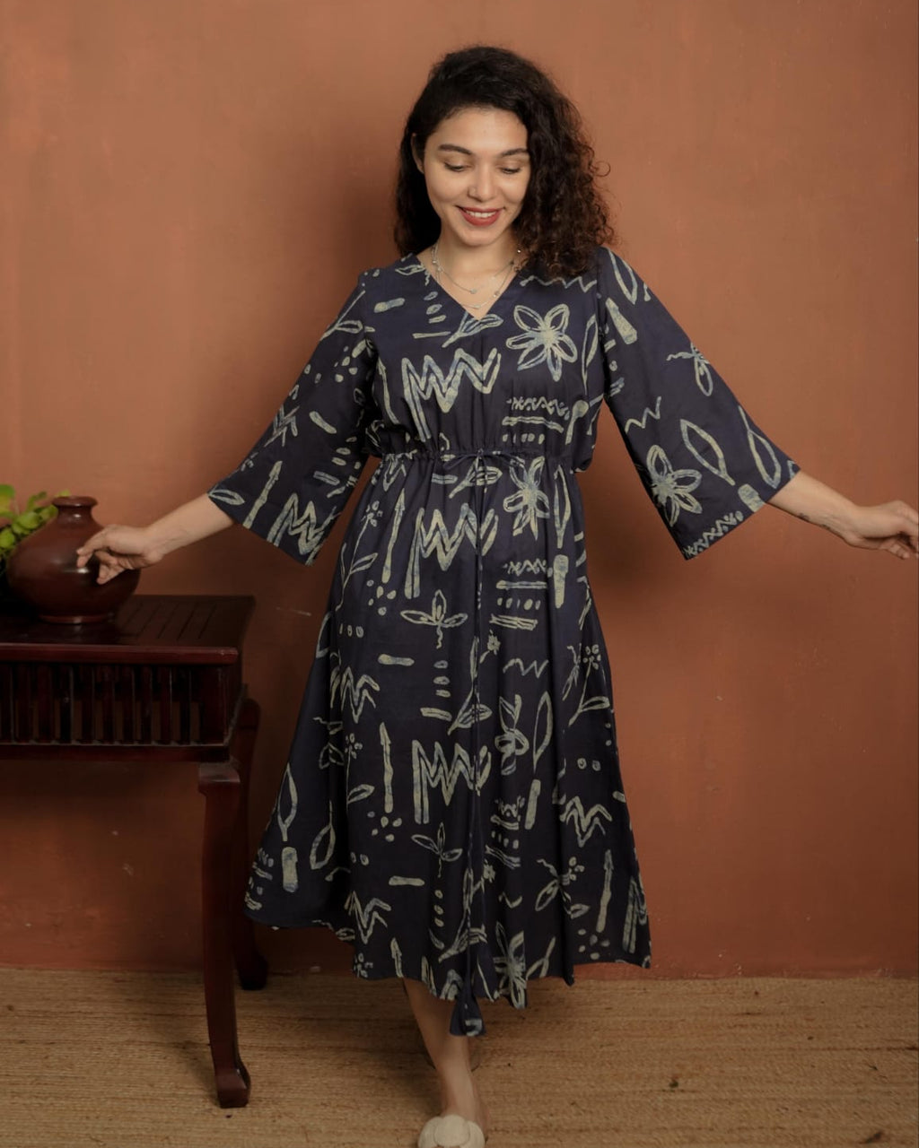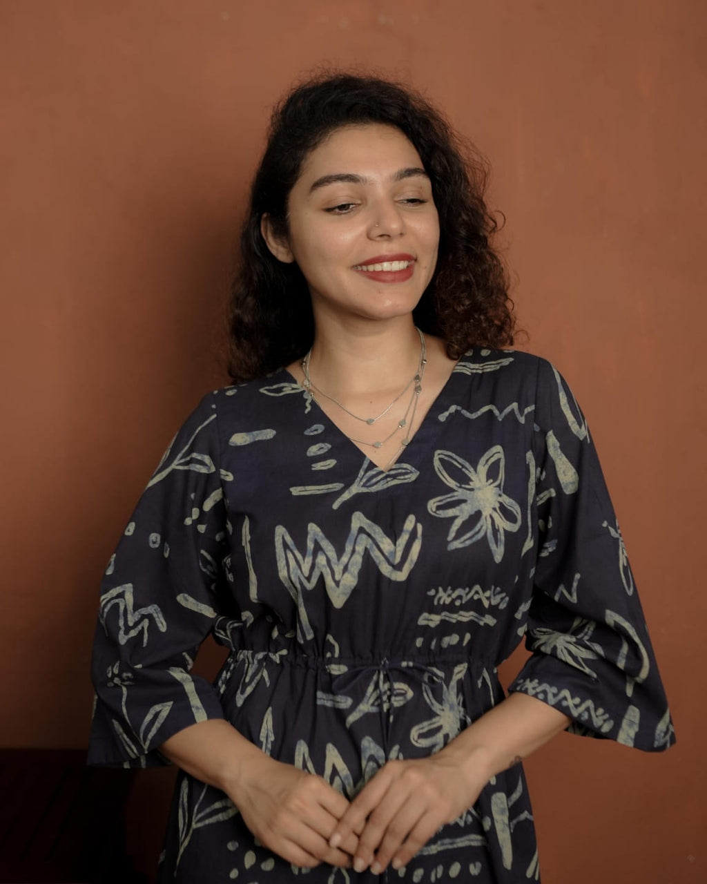 Indigo Cotton Kafthan Dress with V Neck. Shaping Tags on the Waist to make the fitting correct. Loose bell Sleeves.