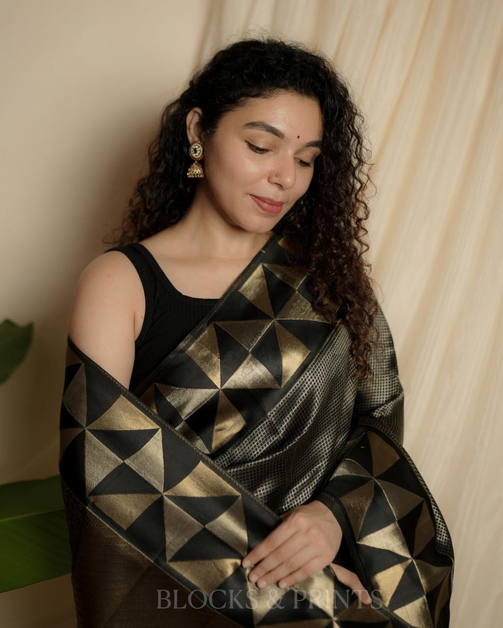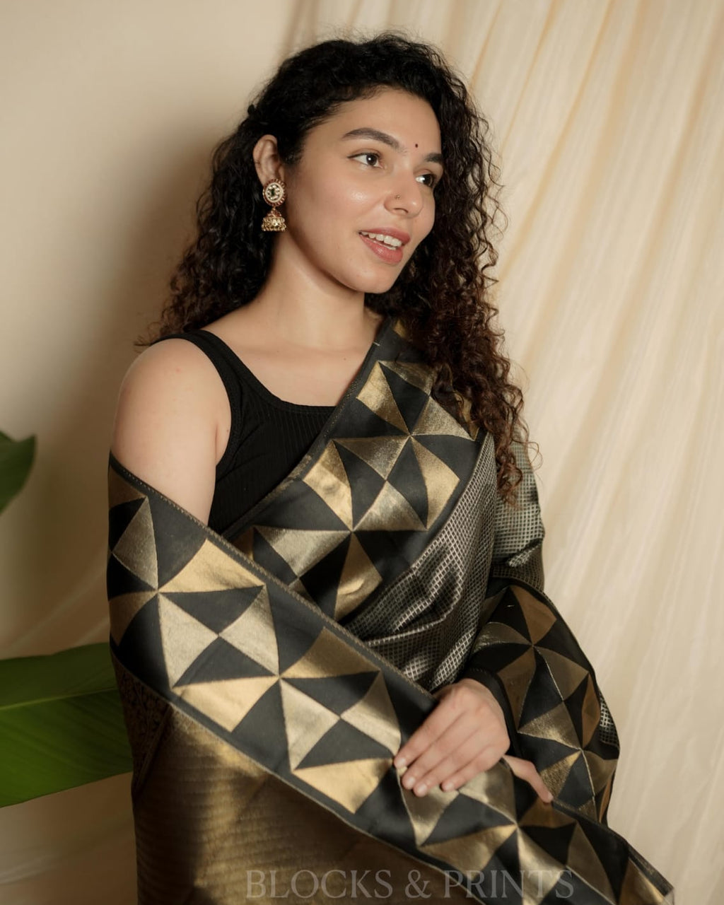 Blouse :- Semi Silk in Plain black color with golden zeri border(Unstitched)