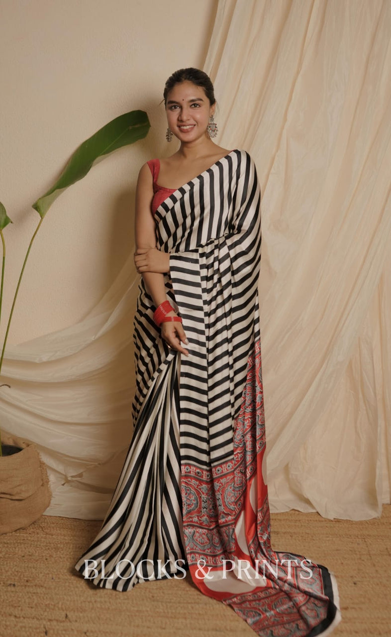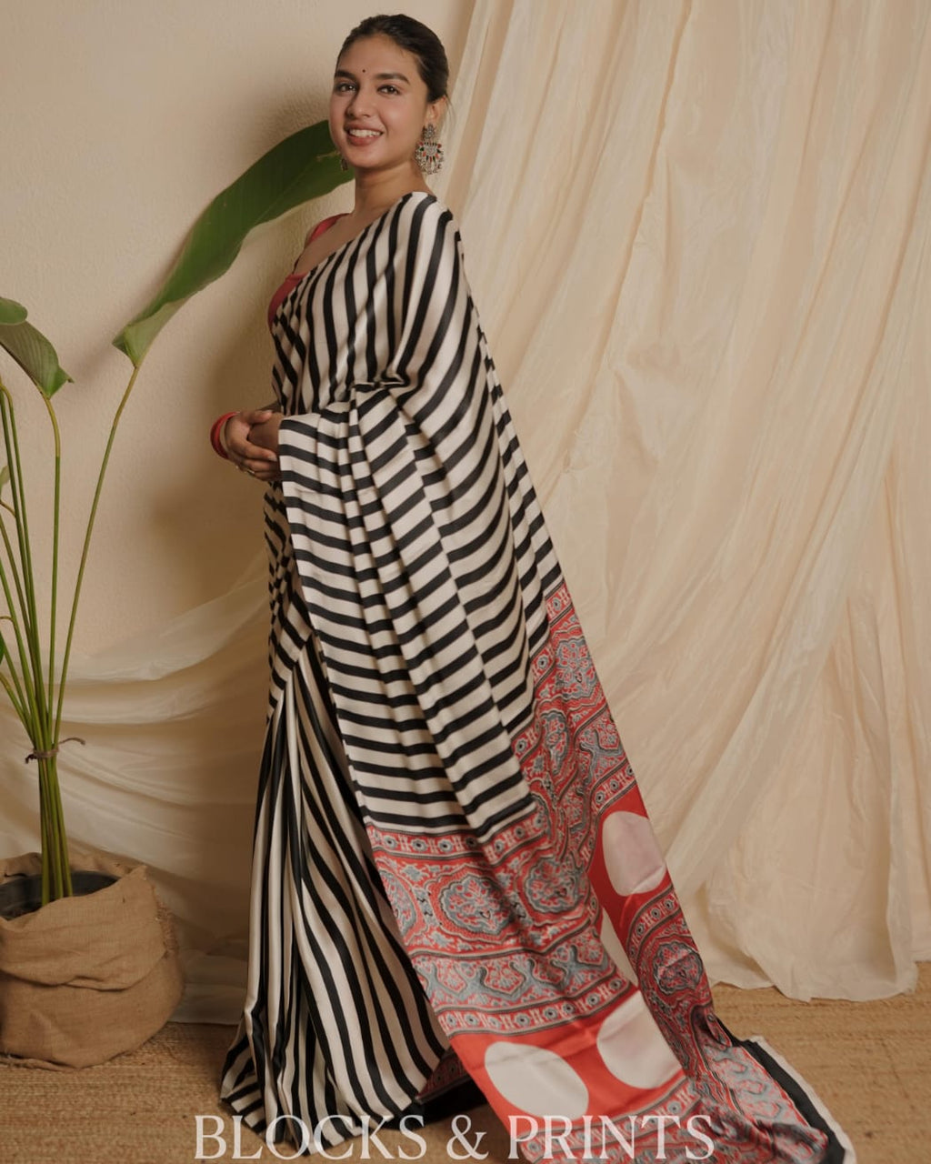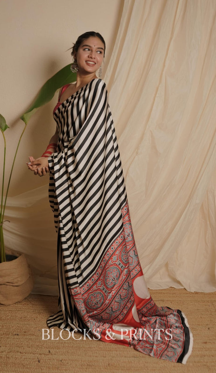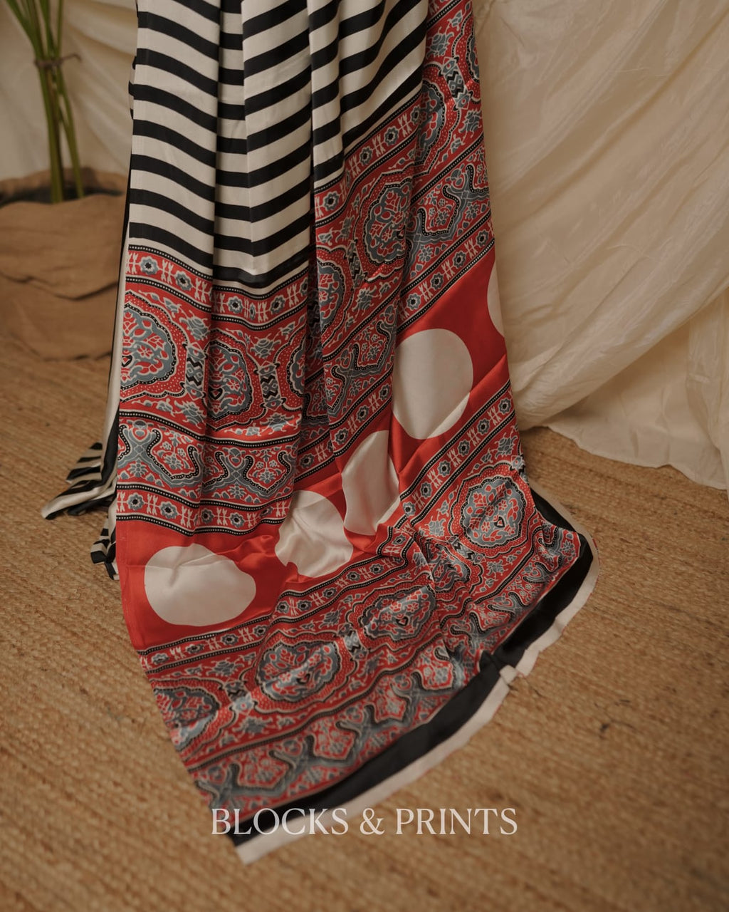 Satin Modal Silk Saree with Ajrakh printed Pallu.