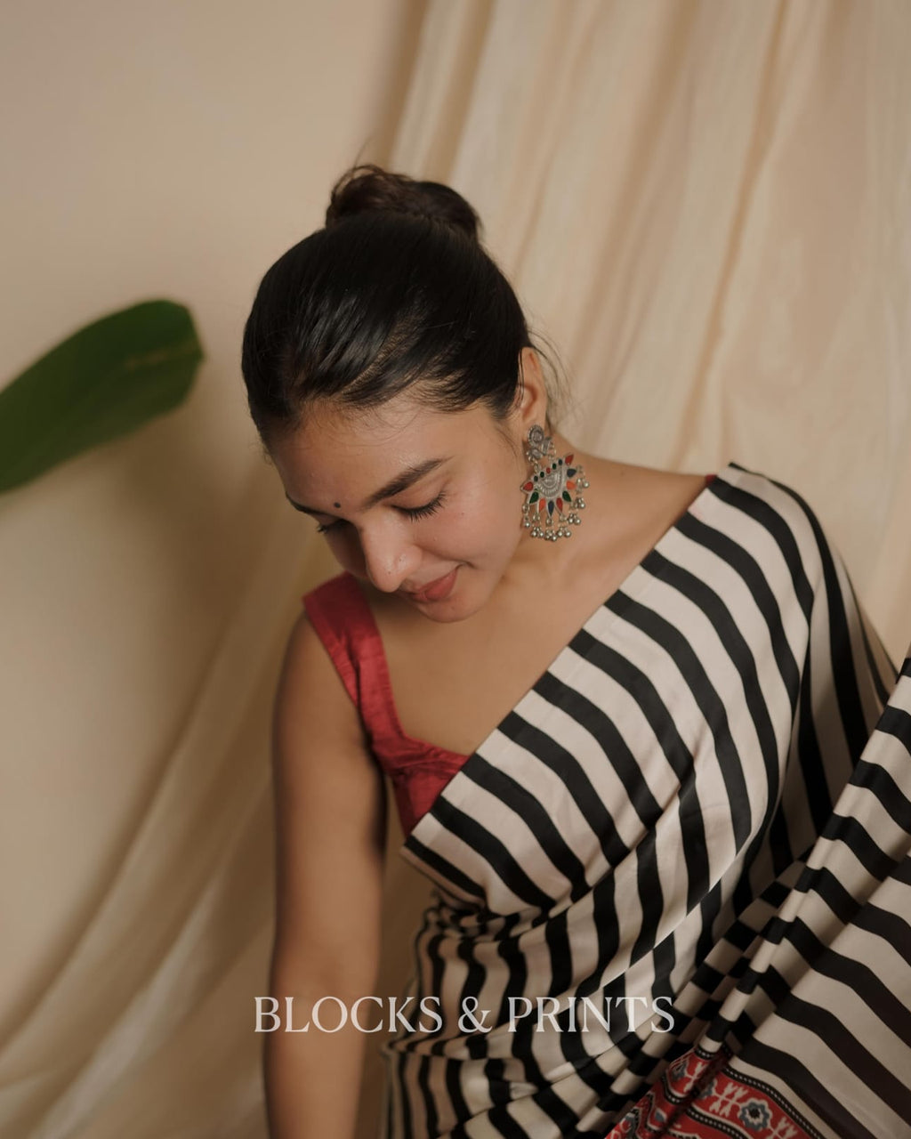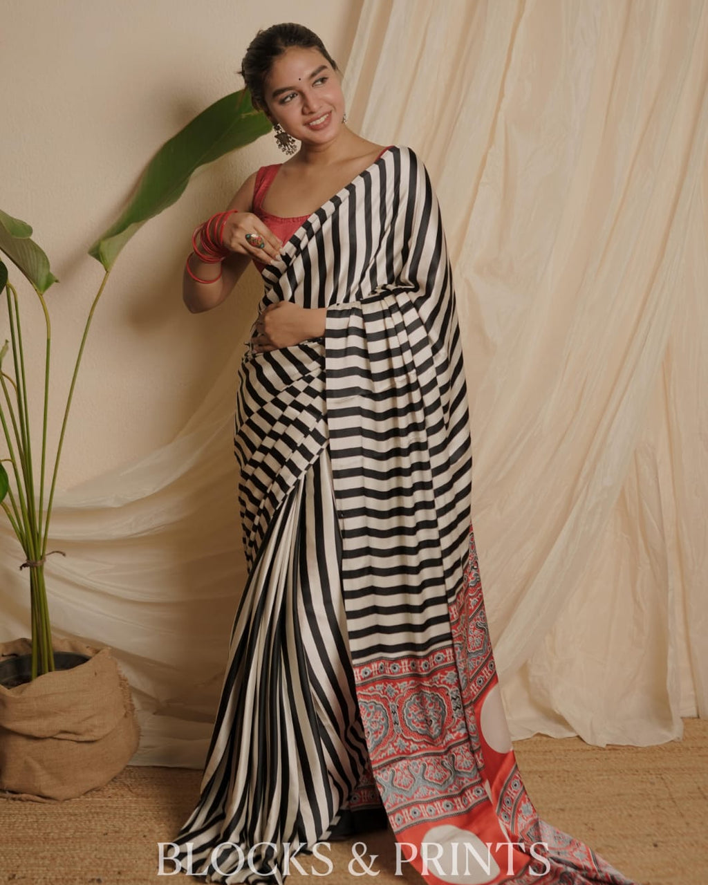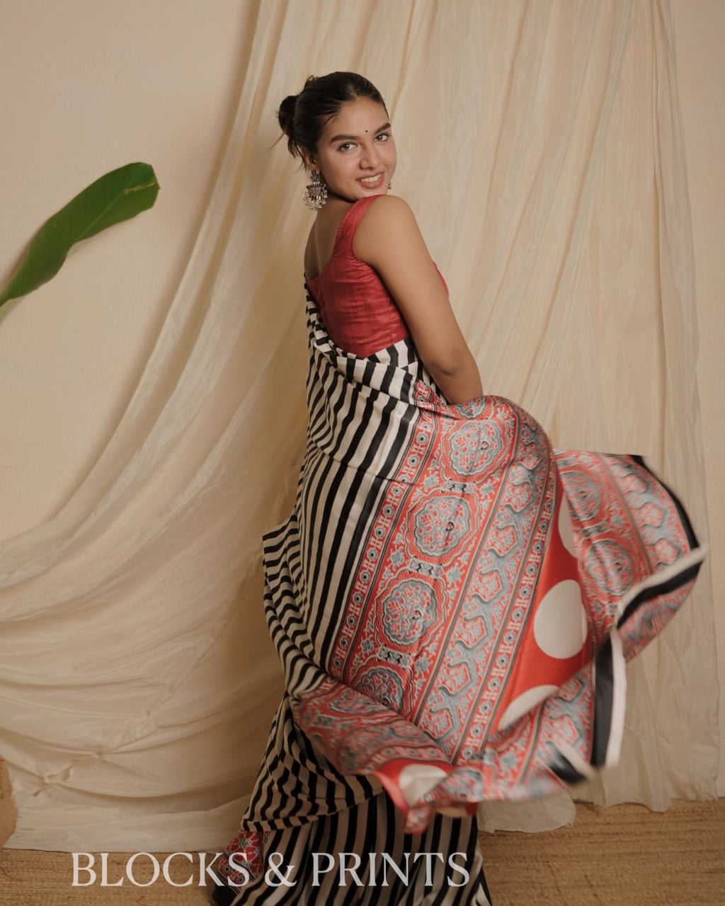 Satin Modal Silk Saree with Ajrakh printed Pallu.