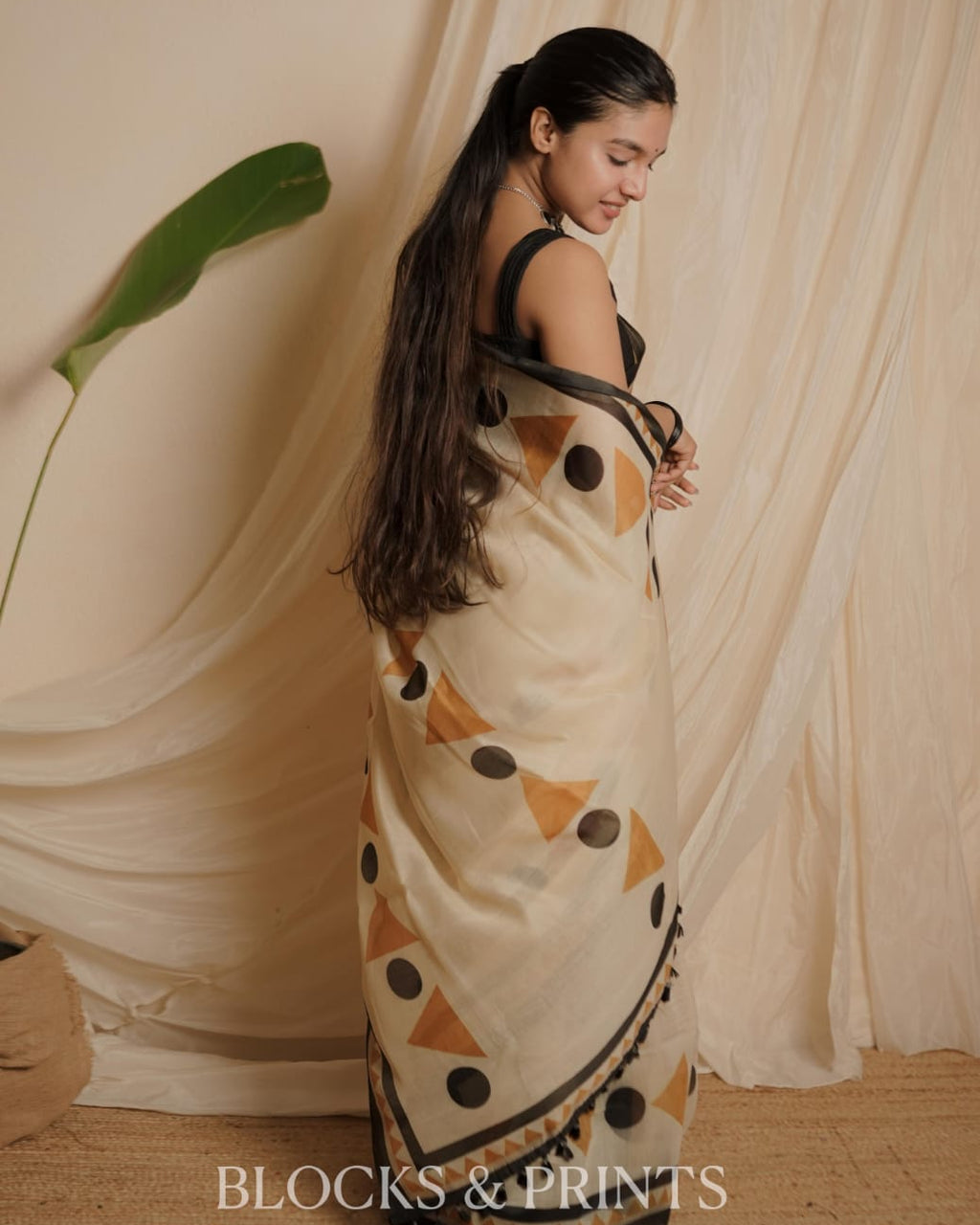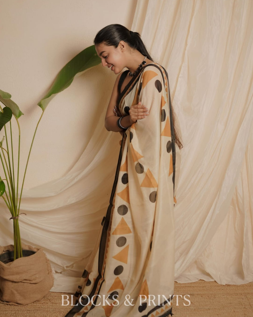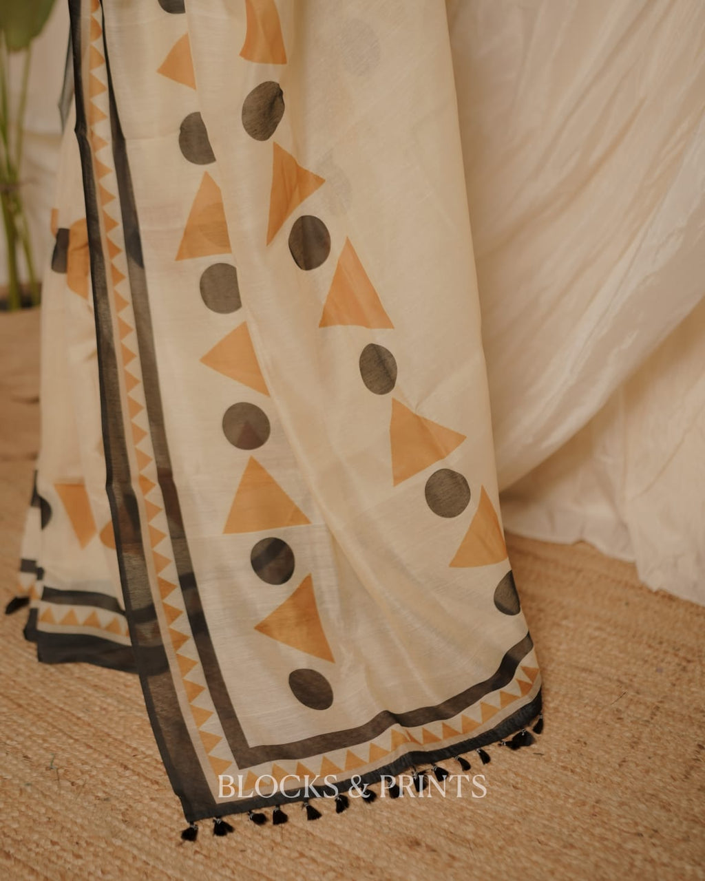 Chanderi  Saree printed with geometric triangles and polka dots in mustard and black, finished with a contrasting black border.. Tassels at the end.