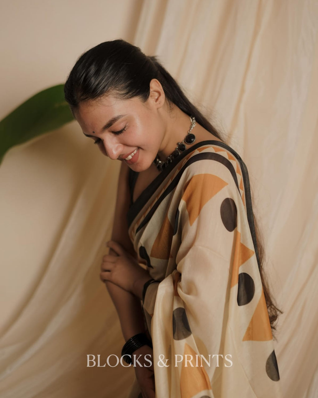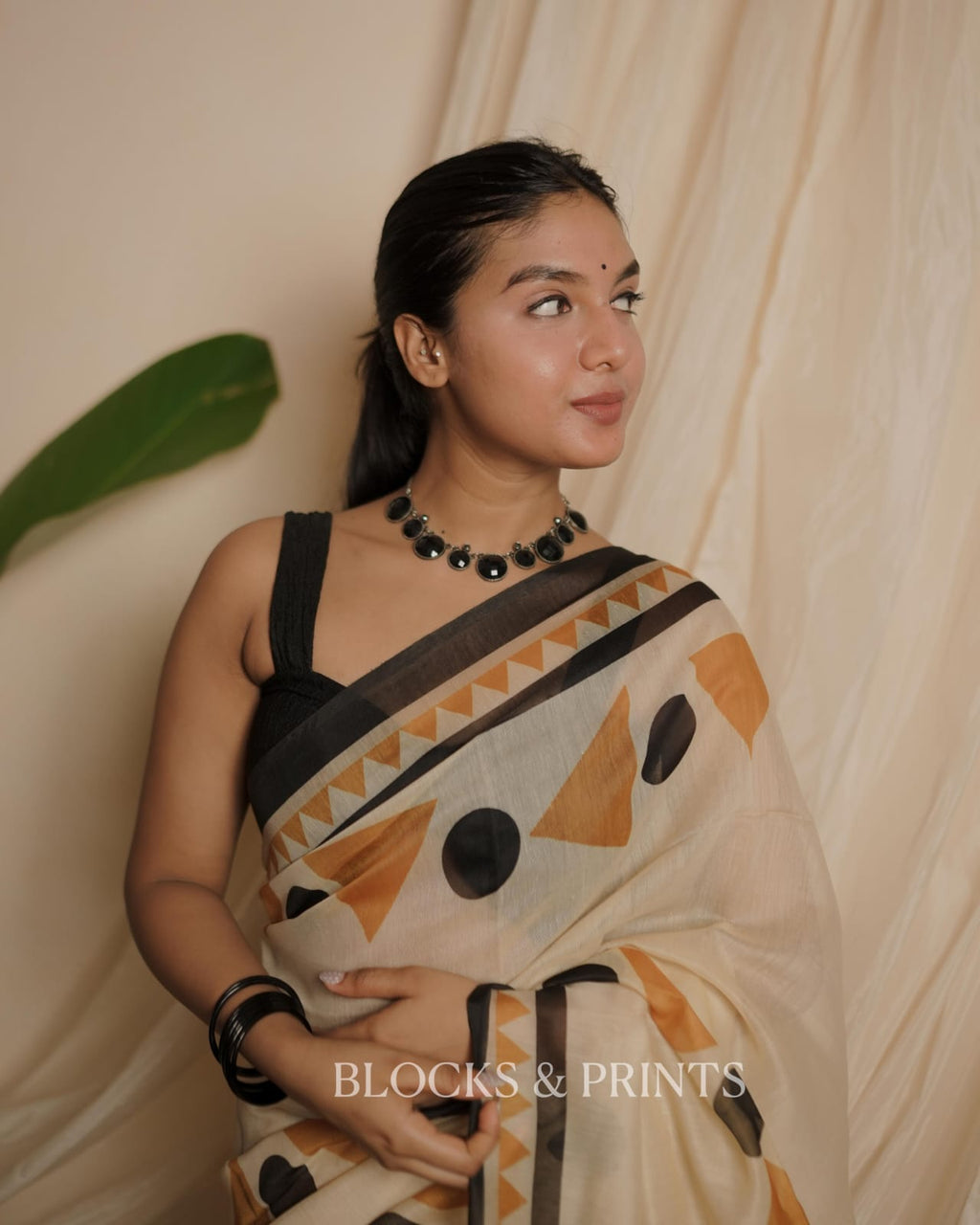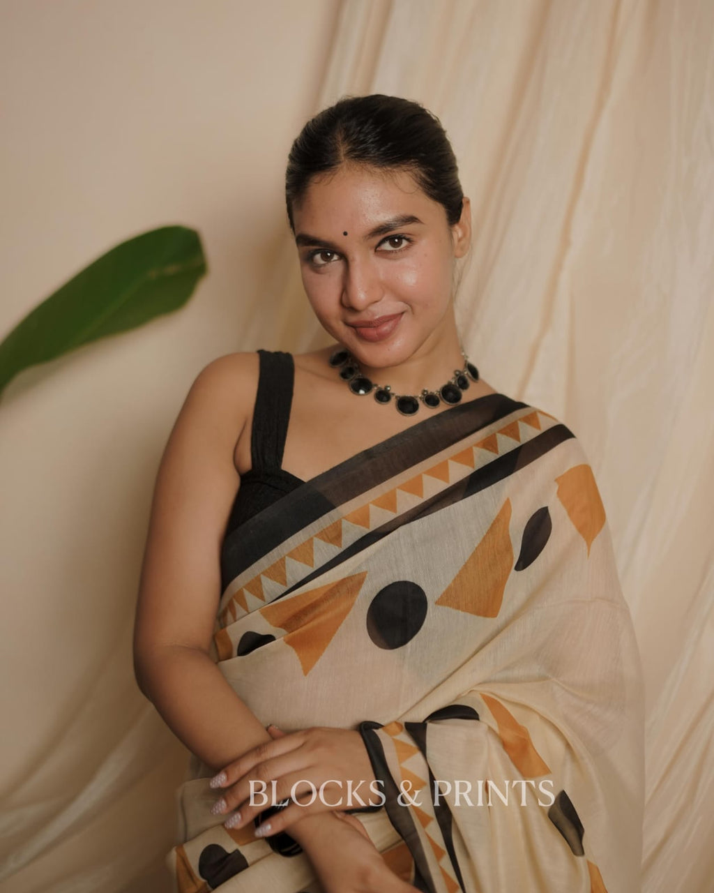 Chanderi  Saree printed with geometric triangles and polka dots in mustard and black, finished with a contrasting black border.. Tassels at the end.