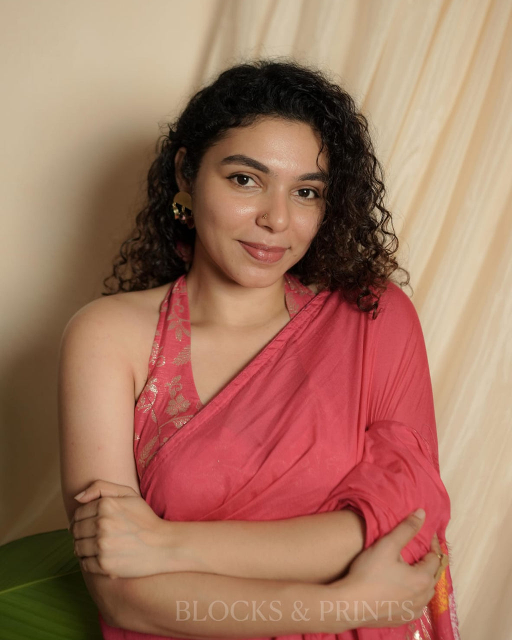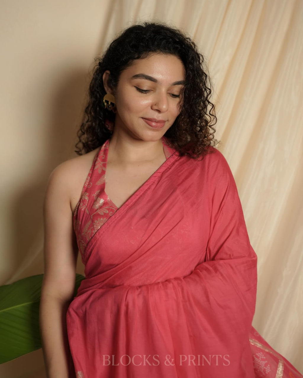 Blouse :- Heavy woven all over Golden floral zeri in Pink Color. (Unstitched) same as in the pic.