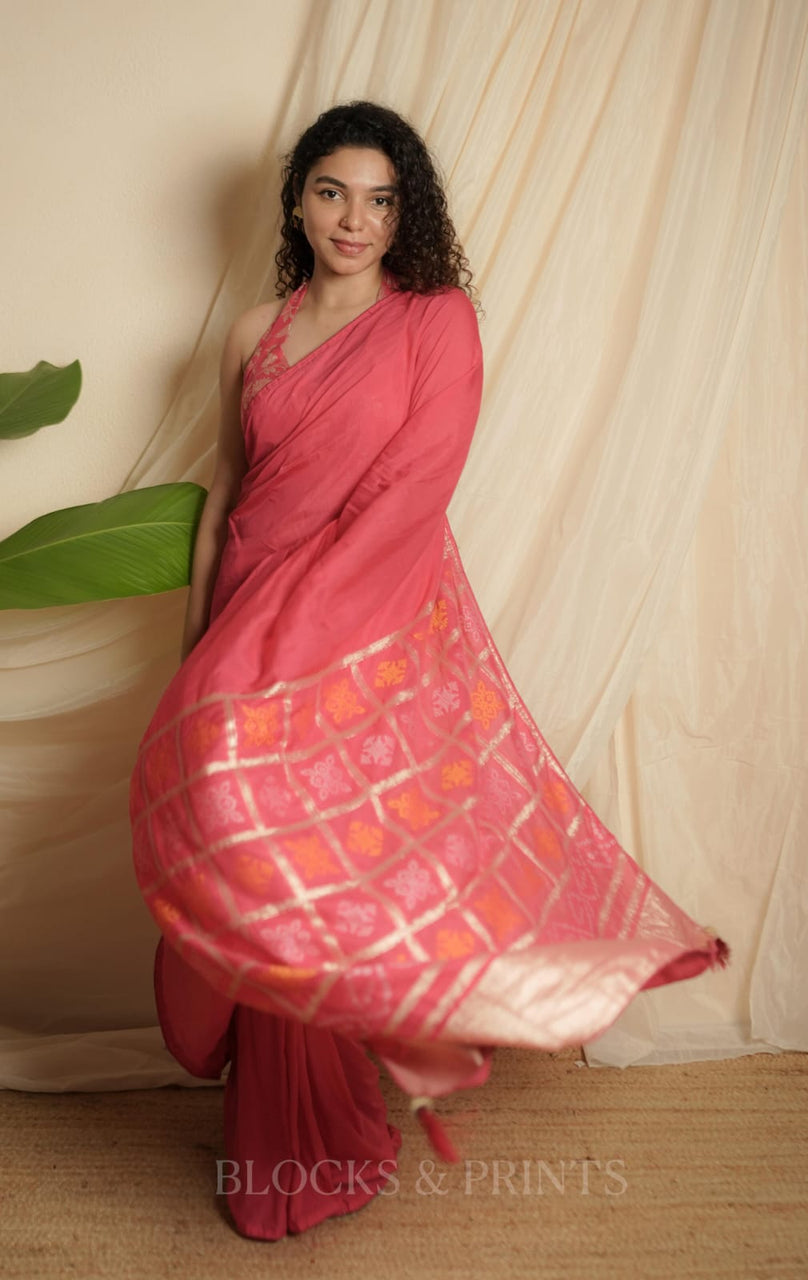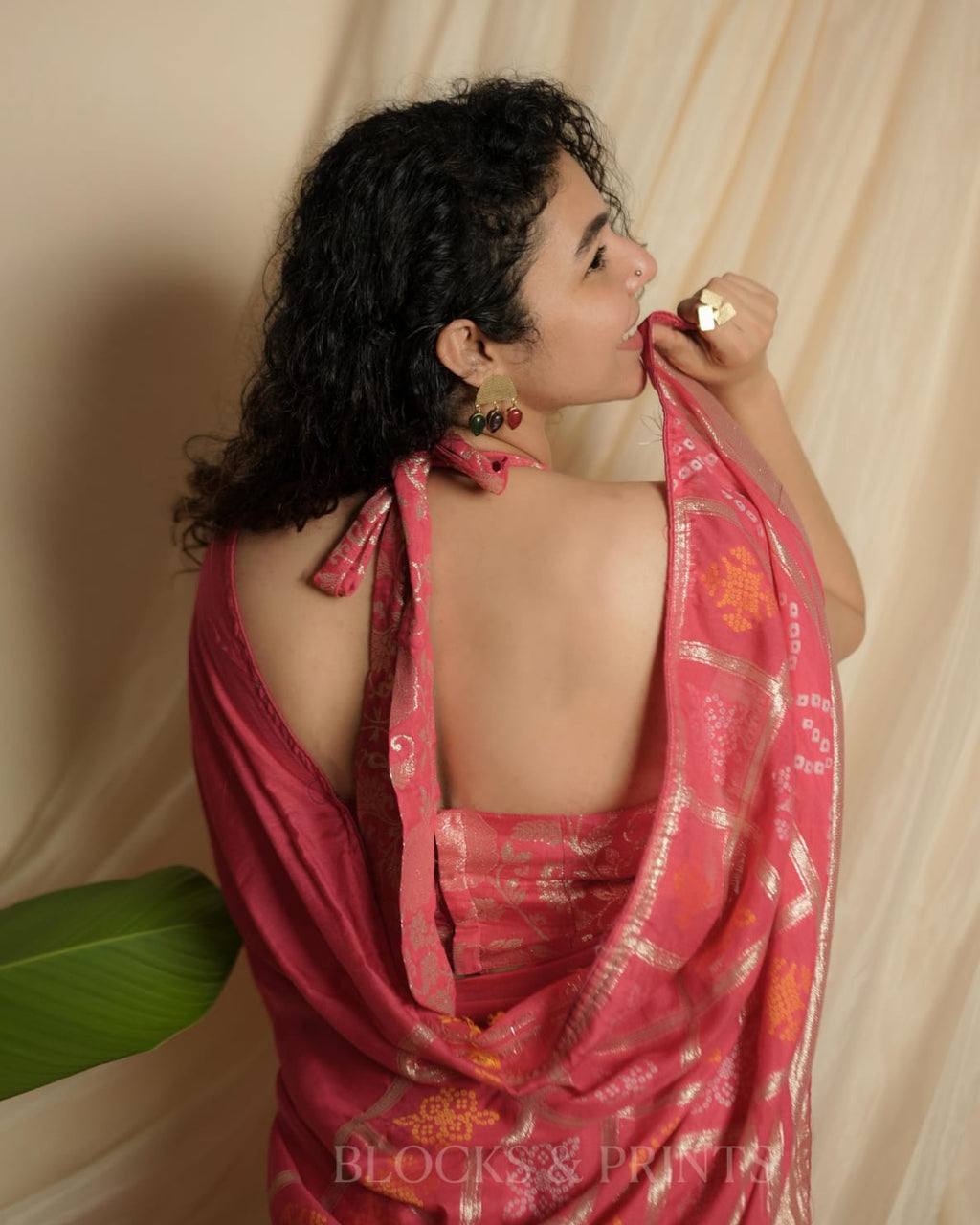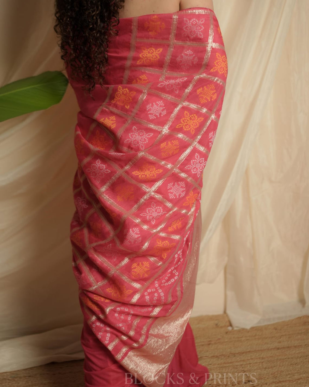 Muslin Silk Saree, Woven zeri Pallu & blouse. Has bandhini print on Pallu. Tassels at end of the pallu.