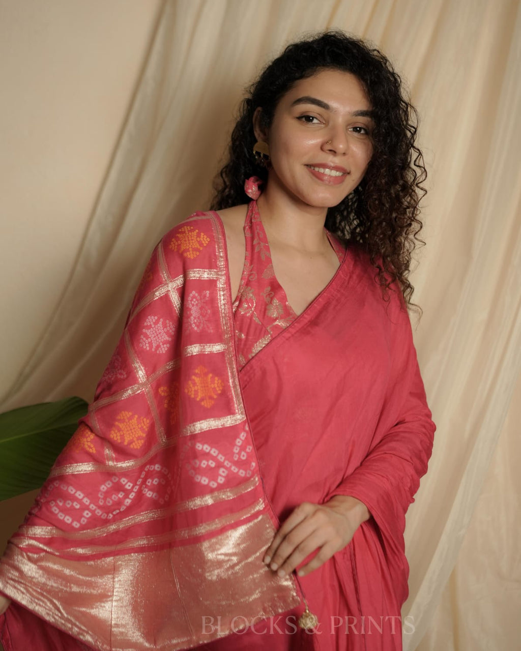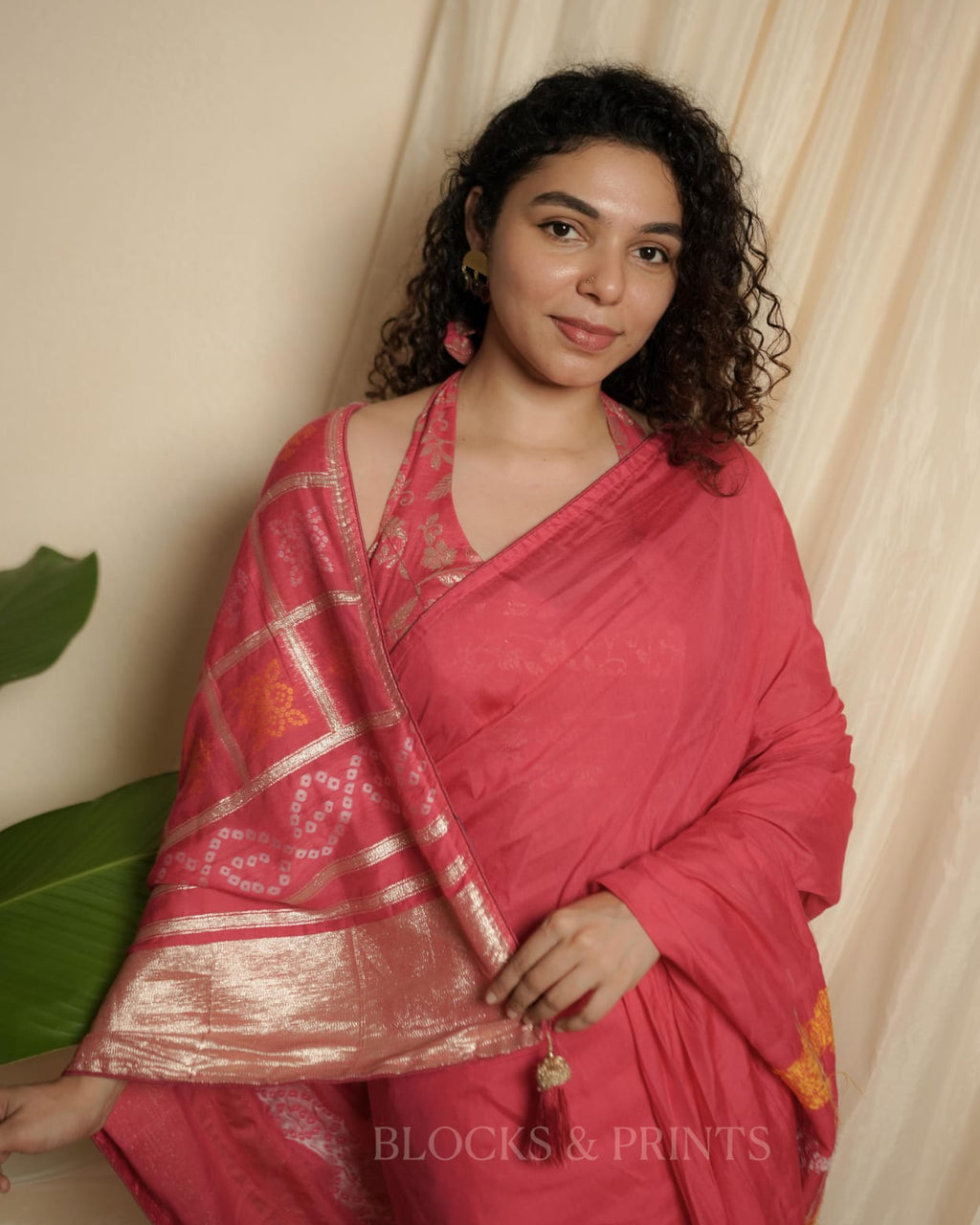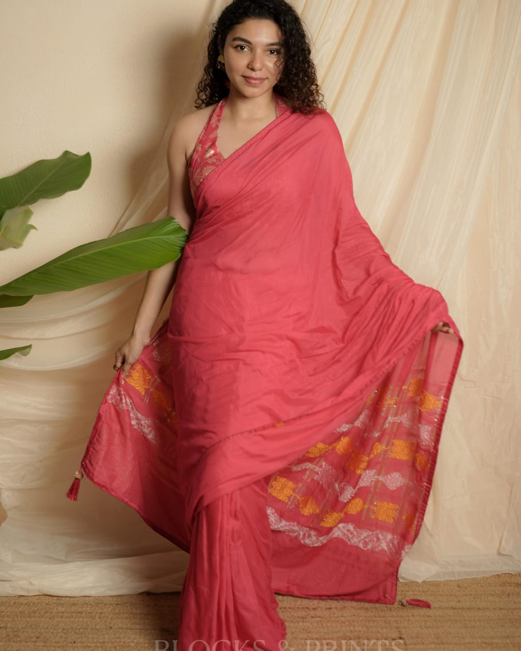 Muslin Silk Saree, Woven zeri Pallu & blouse. Has bandhini print on Pallu. Tassels at end of the pallu.