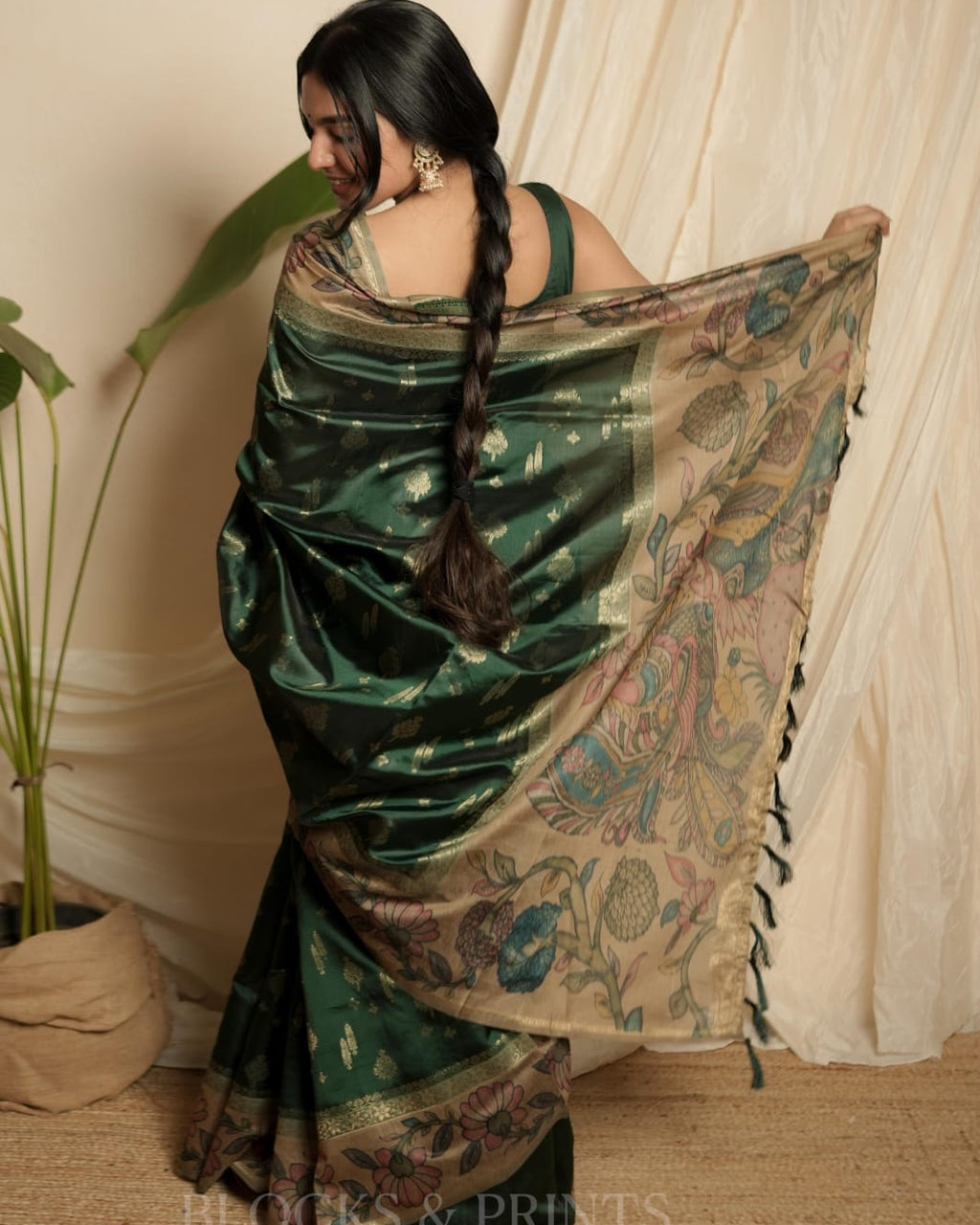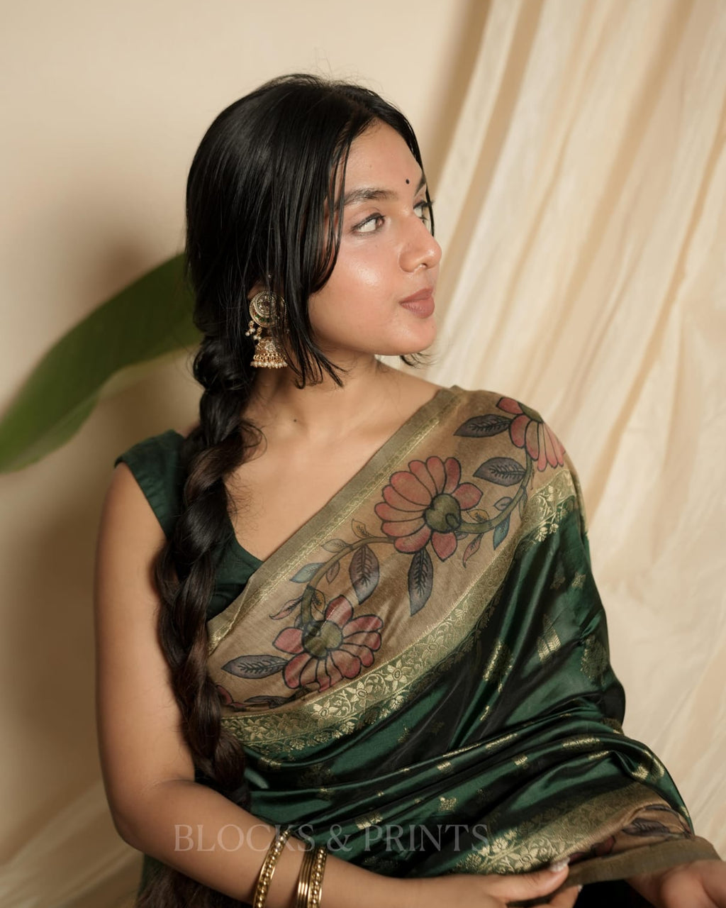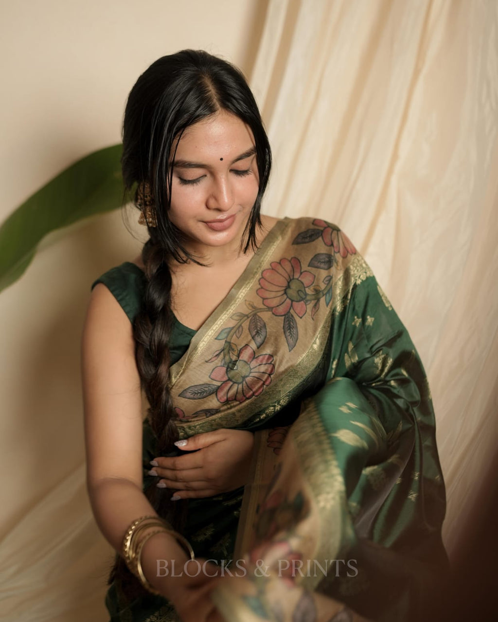 Floral printed border saree with Woven designs at the body. Tassels at the End.