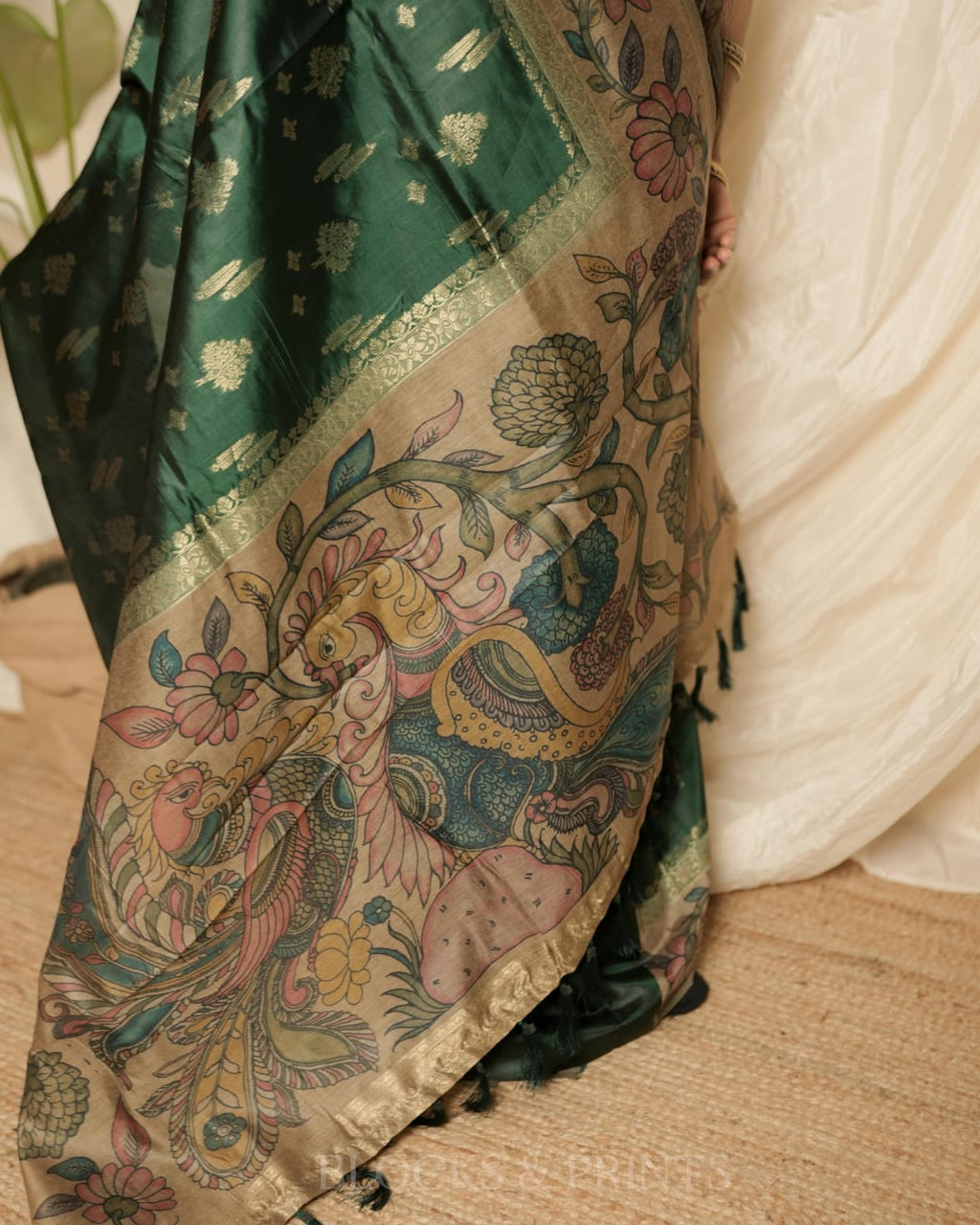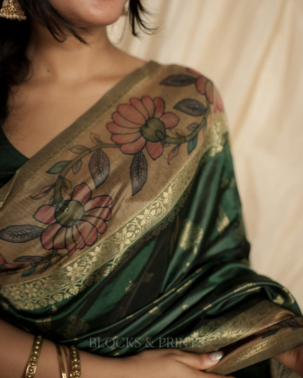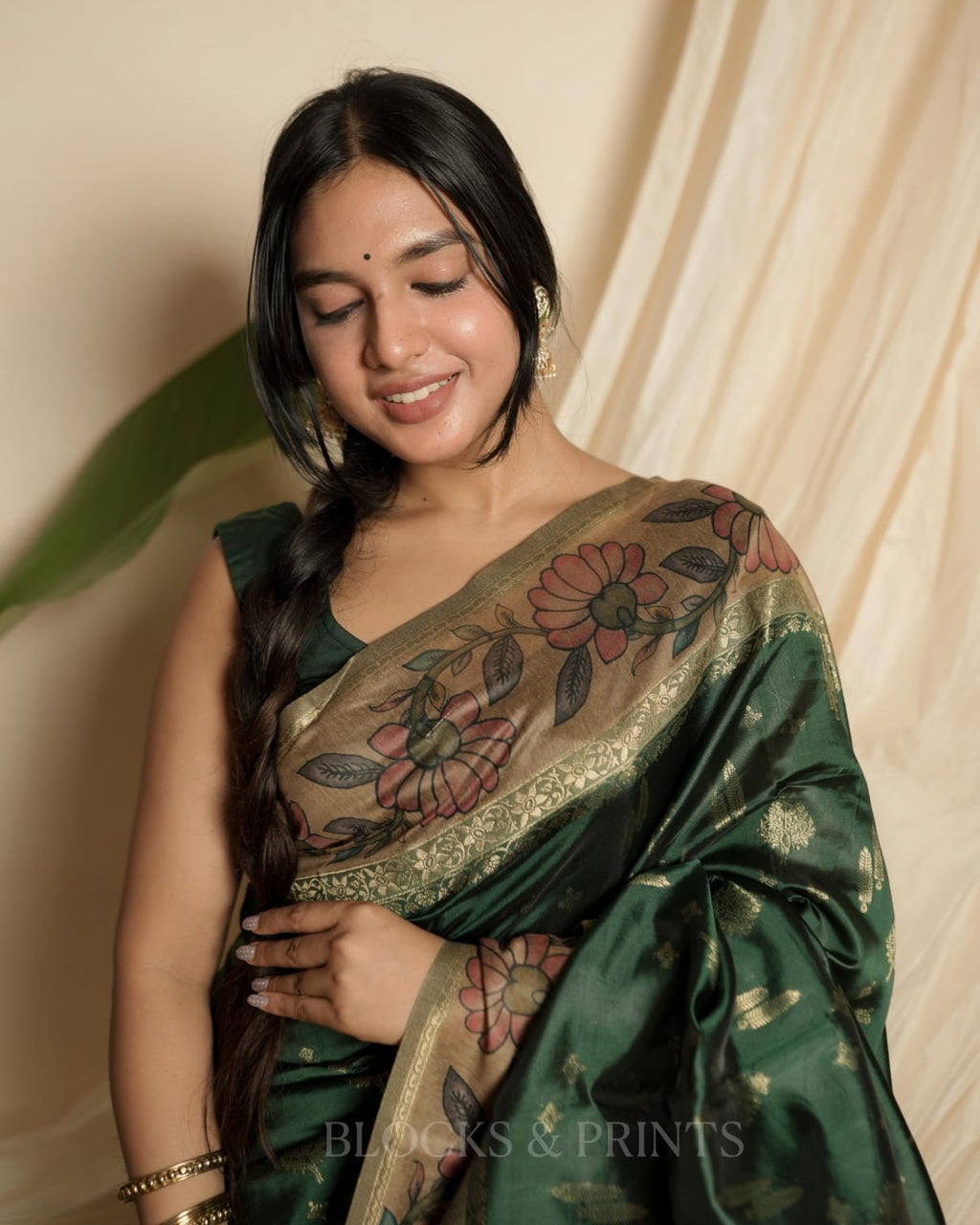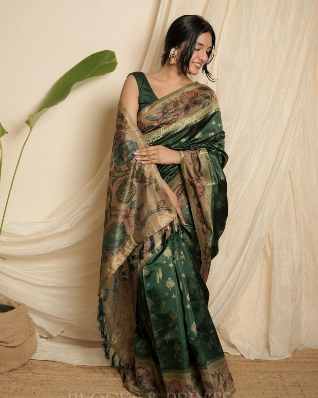 Floral printed border saree with Woven designs at the body. Tassels at the End.