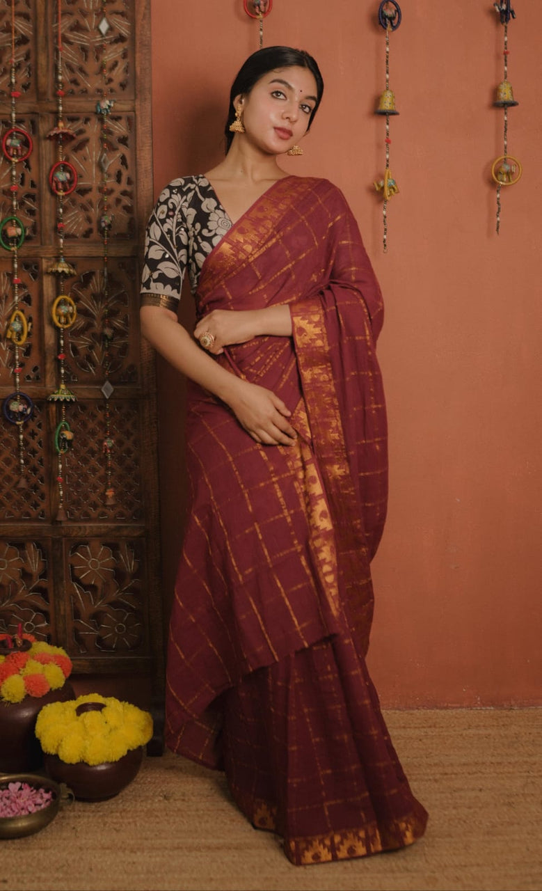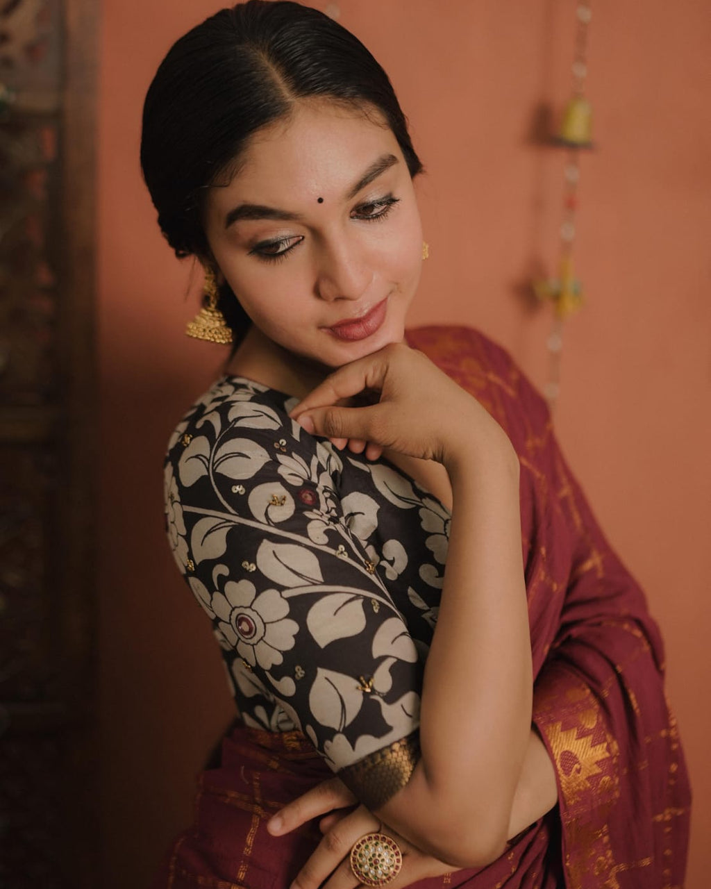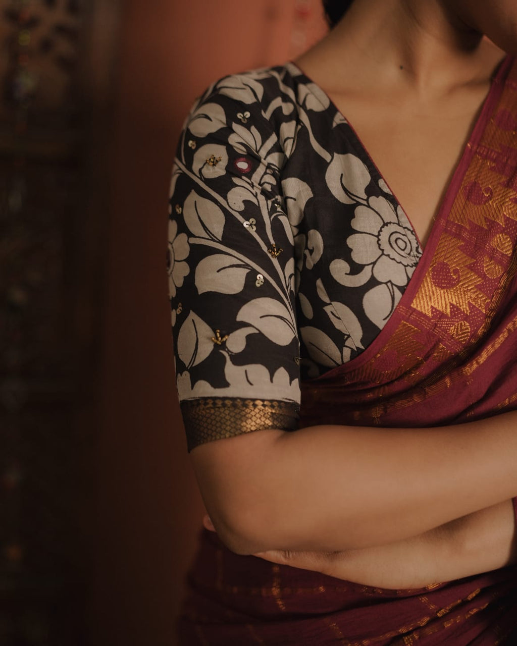 Blouse - Handloom Soft Silk in Kalamkari Print with Zeri Border. Hand work and Mirror work on the sleeves portion. (Unstitched Blouse)